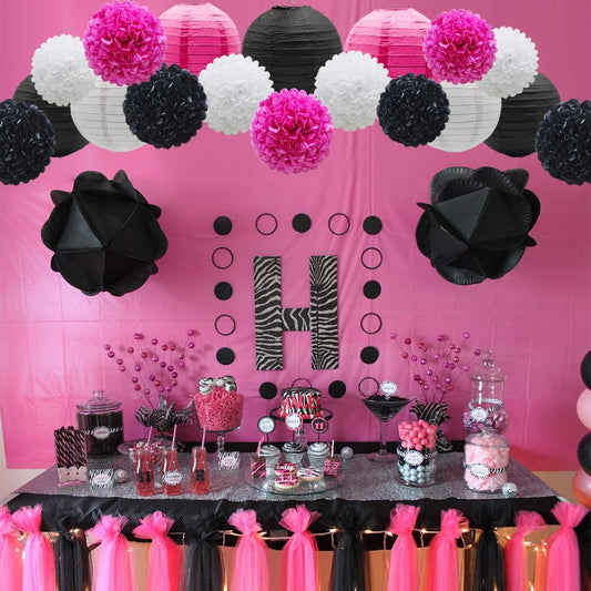 Pink ,Black And White Tissue Paper Pom Poms And Paper Lanterns