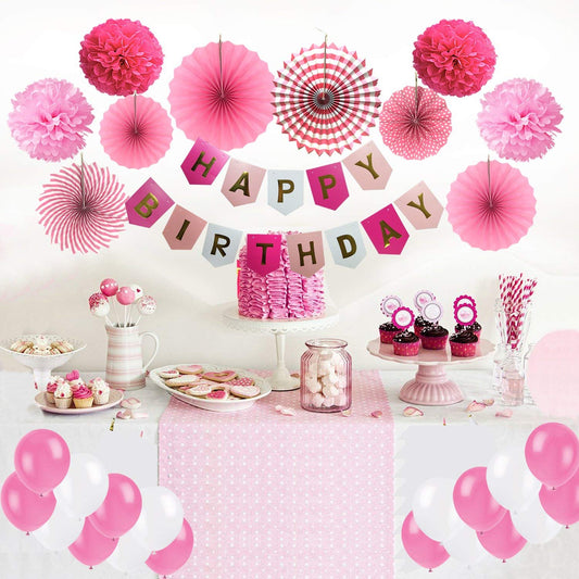 Pink Paper Party Decorations Paper Fans Set and Paper Pompoms Flowers