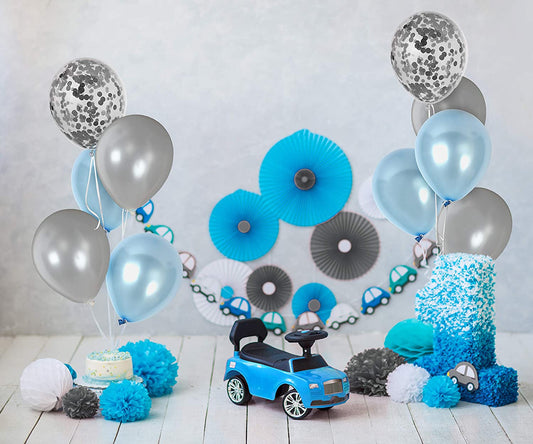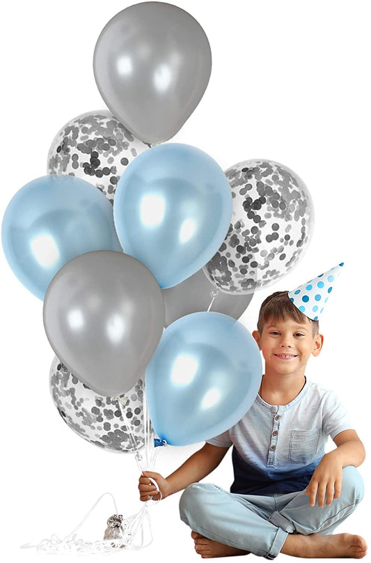 Metallic Silver And Blue Balloons And Silver Confetti Balloon(With Ribbon)