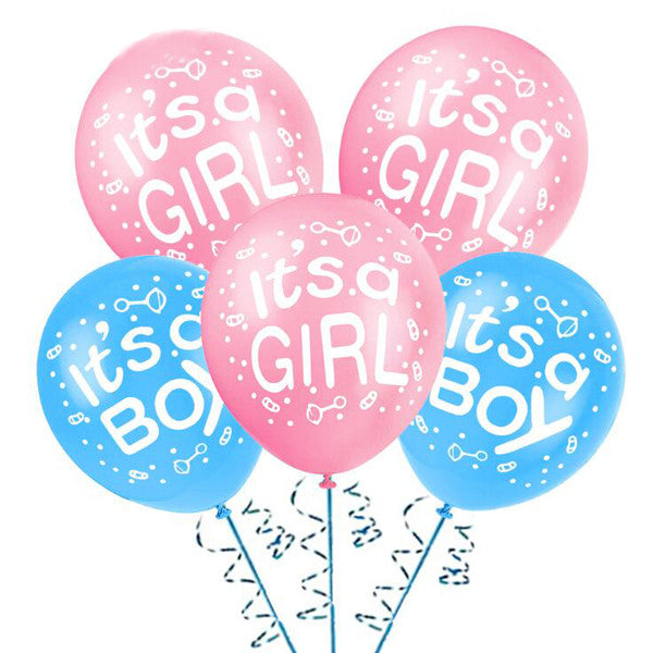 - Baby shower balloon decoration- printed on pink - "It's a girl" balloons + printed on blue "It's a boy" pattern.