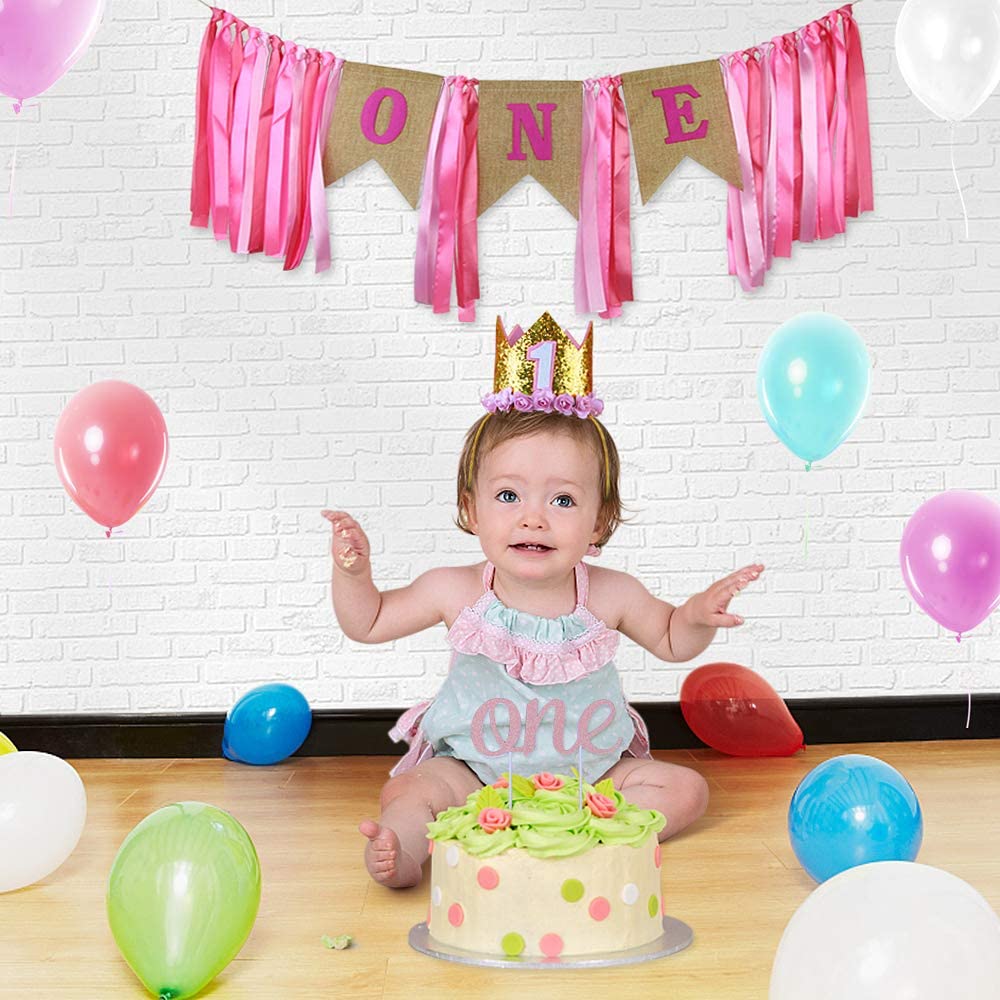 - Package includes: a "one" birthday burlap banner, a lovely birthday crown and a sparkling birthday cake topper.