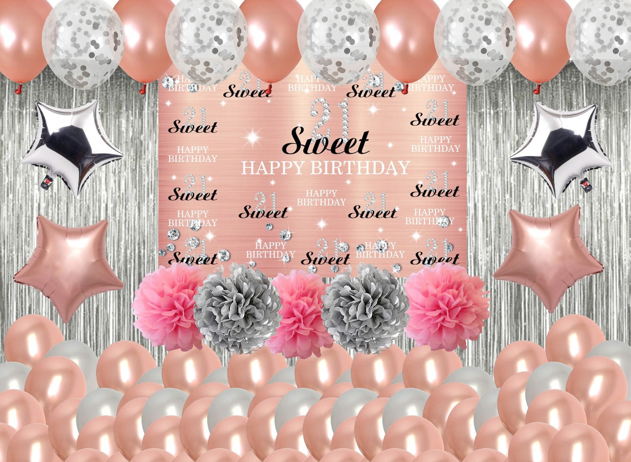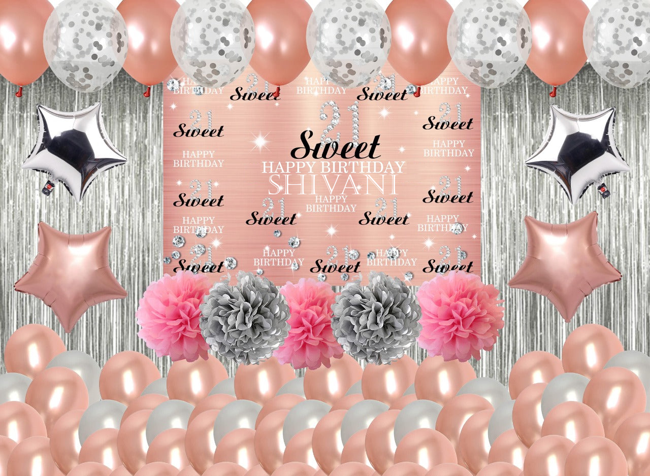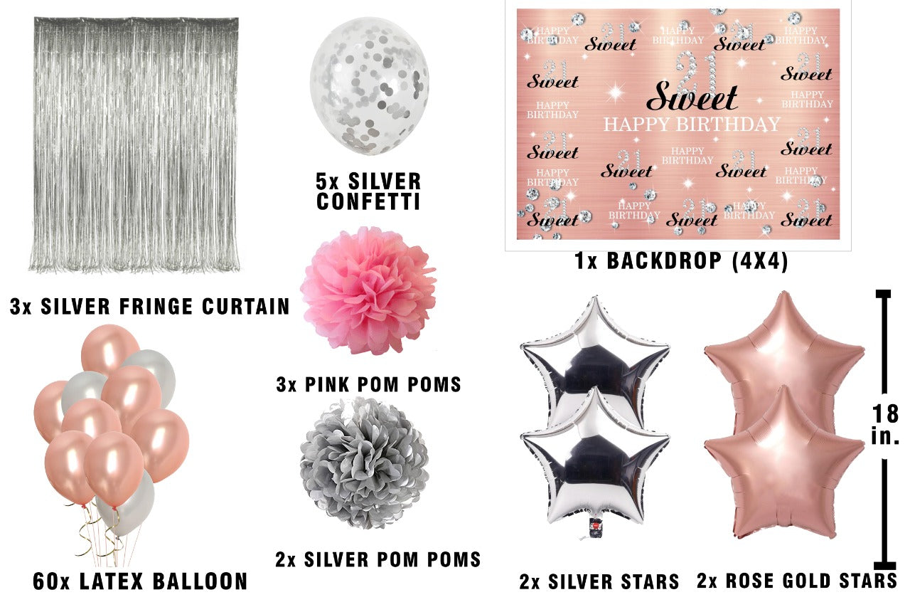 - Package Includes -3 Pcs Silver Fringe Curtains, Backdrop - 4 by 4 ft, Balloons- 60 pcs Rose Gold and Silver , 5 pc Silver Confetti and 4 pcs (2 pc each Pink and Silver Star) and 5 pompom white and pink.