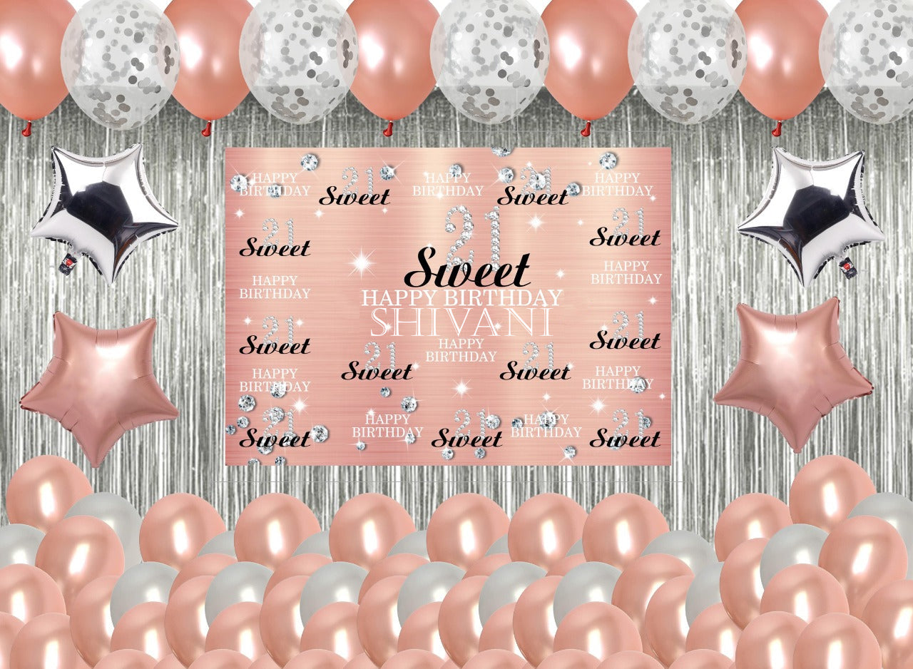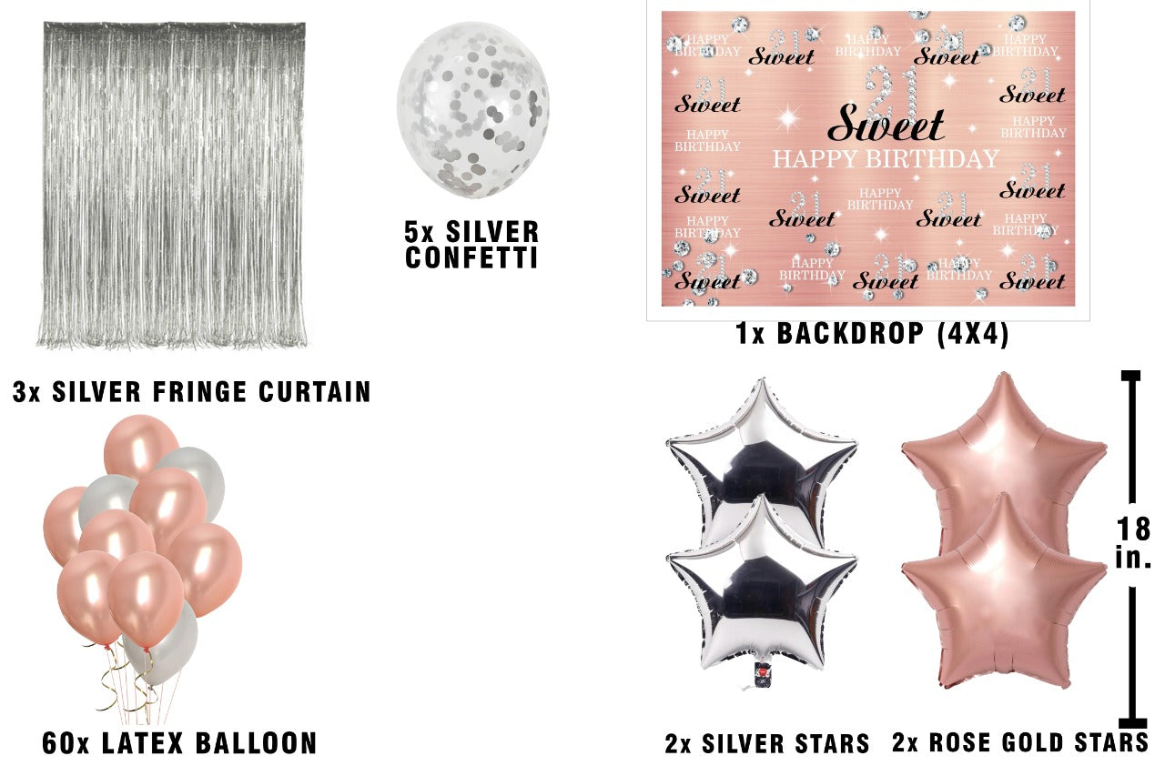 - Package Includes -3 Pcs Silver Fringe Curtains, Backdrop - 4 by 4 ft, Balloons- 60 pcs Rose Gold and Silver , 5 pc Silver Confetti and 4 pcs (2 pc each Pink and Silver Star) .
