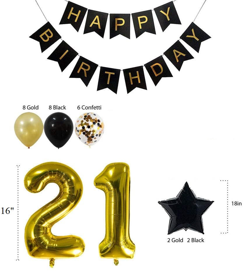 Great Value for 21st Birthday Decoration Pack: Including Happy Birthday Banner, 21 Number balloons, 4x Star Balloons 16x latex Balloons and 6x Confetti Balloons, 2x Gold Foil Fringe Curtains.