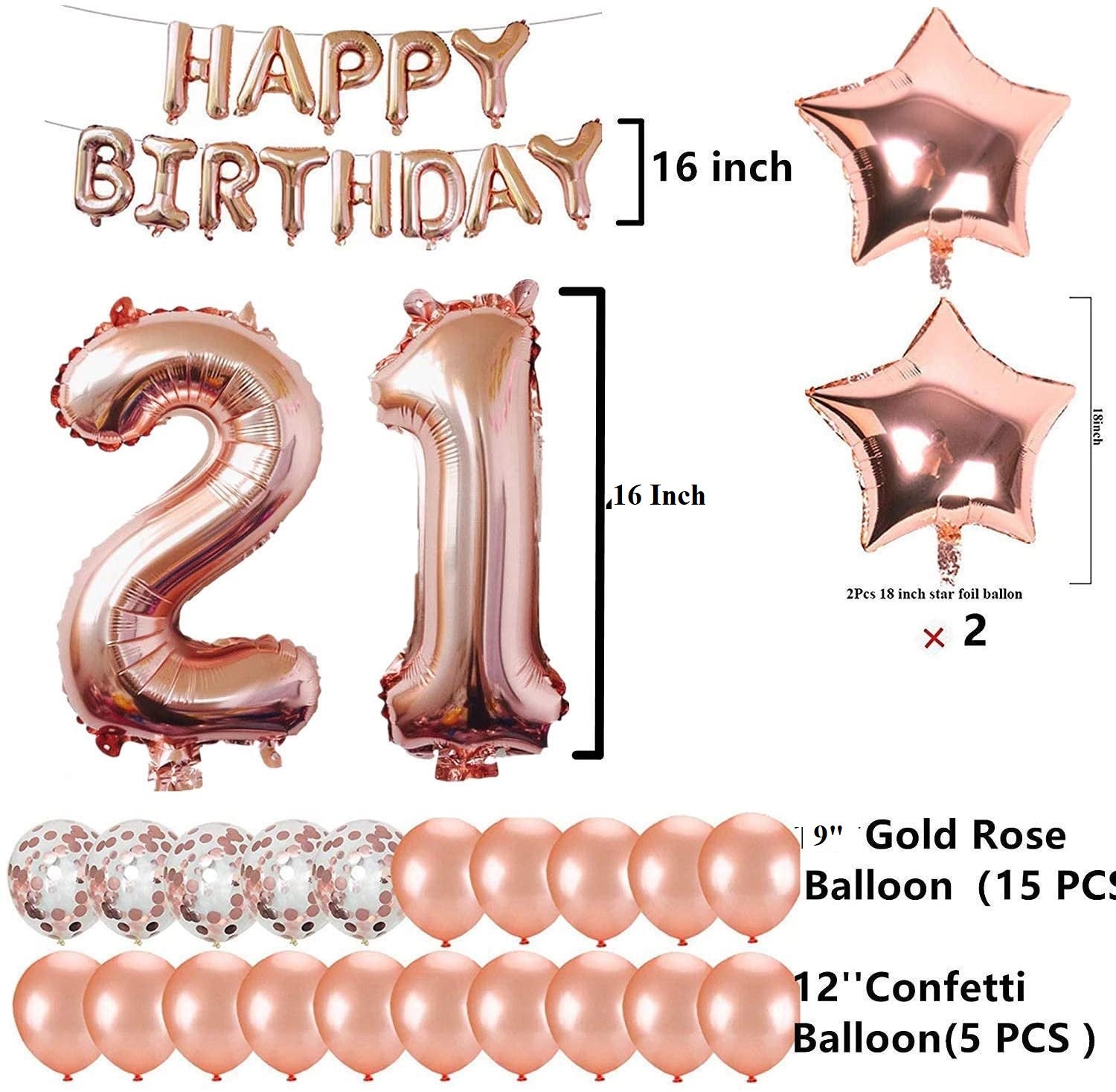 Package includes: 16 Inch rose gold foil balloons "21" set, 16 inch "HAPPY BIRTHDAY DAY" banner balloons,2pcs 18 inch star balloons,,5 pcs confetti balloons and 15pcs latex balloon