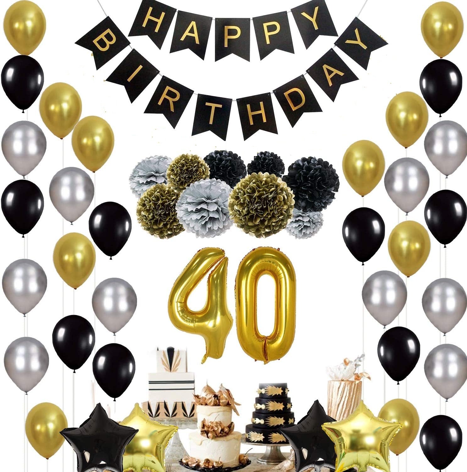 - PERFECT BIRTHDAY SUPPLIES: Featuring black and gold banner, balloons and decorations, the birthday party set for men and women will bring style and happiness to your next birthday party adding the perfect touch for your celebration. 40th birthday's are a special event - make it a unique celebration with silver, black & gold themed balloons and banner.