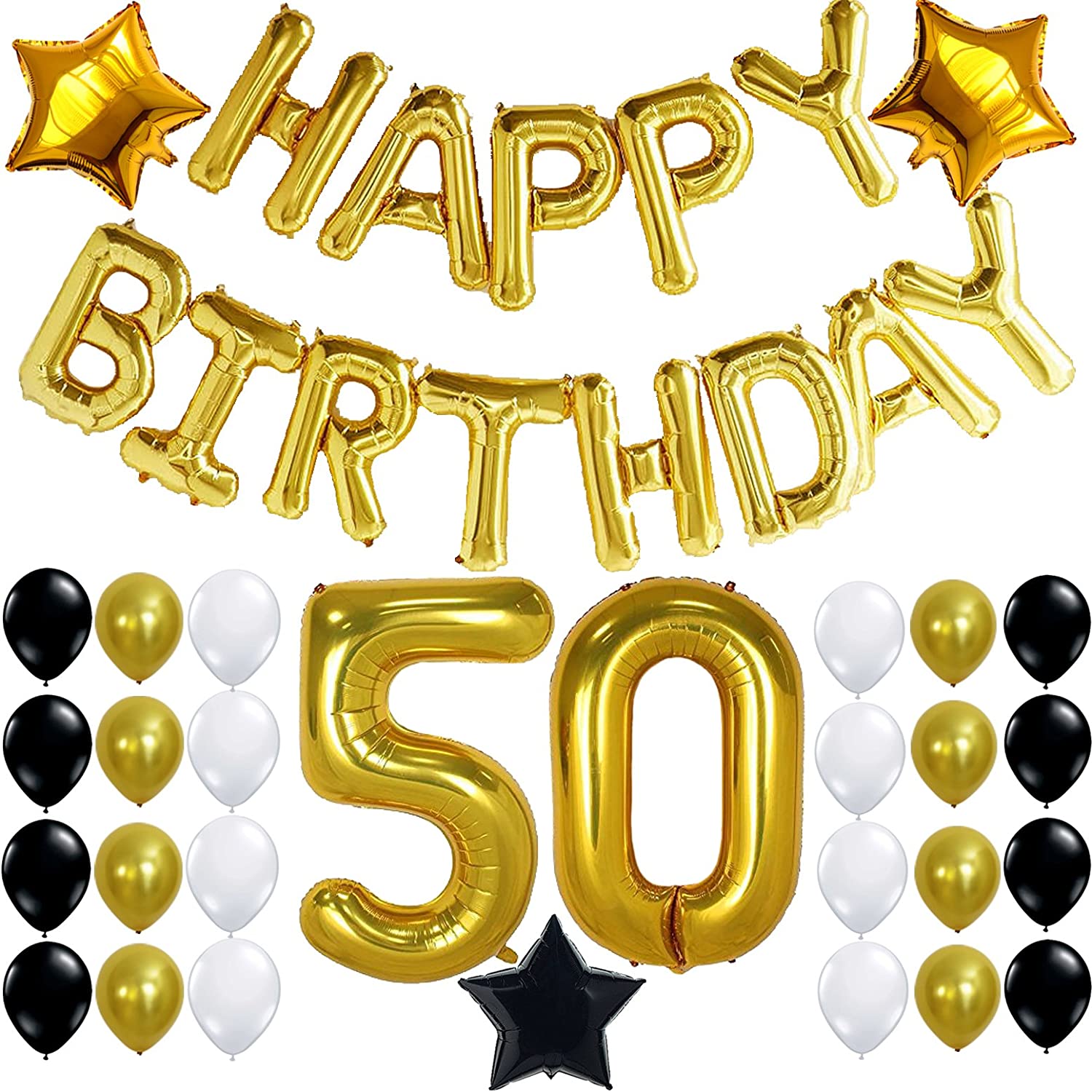 - LARGE SIZE NUMBER 50 BALLOONS | COMPLETE HAPPY 50 BIRTHDAY BALLOONS SET – This Gold 50th Birthday Decorations pack that comes with a number 5 and 0 gold balloons, Gold Happy Birthday Mylar Foil Balloon Banner, pack of 3 Star Foil Balloons and pack of 27 black, gold and white latex balloons. A great add-on to an anniversaries, beach party, holidays or even use it as a home/office adornment.