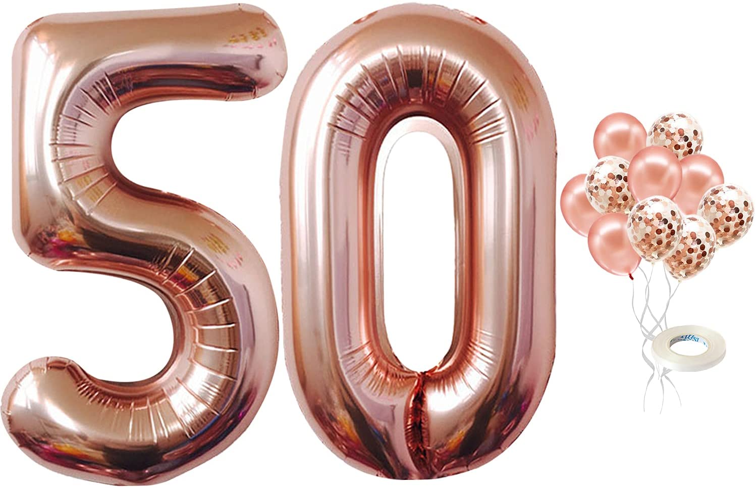 - Package include : 16 inch 50 number foil balloon, 5 Rose Gold latex balloons 9 inch, 5 Rose Gold confetti balloons 12 inch.