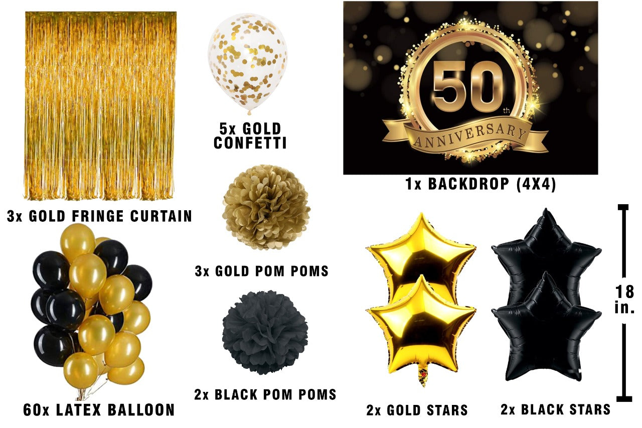- Package Includes -Backdrop-flex material light and thin, Balloons- 60 pcs Metallic Black and Golden, 3 pcs Golden Fringe Curtains, 4 pcs Star Balloons (Black and Golden), 5 pcs Golden Confetti Balloons, 5 pcs Pompom (3 Golden and 2 Black). All of the kits are useful for 50th Anniversary parties.