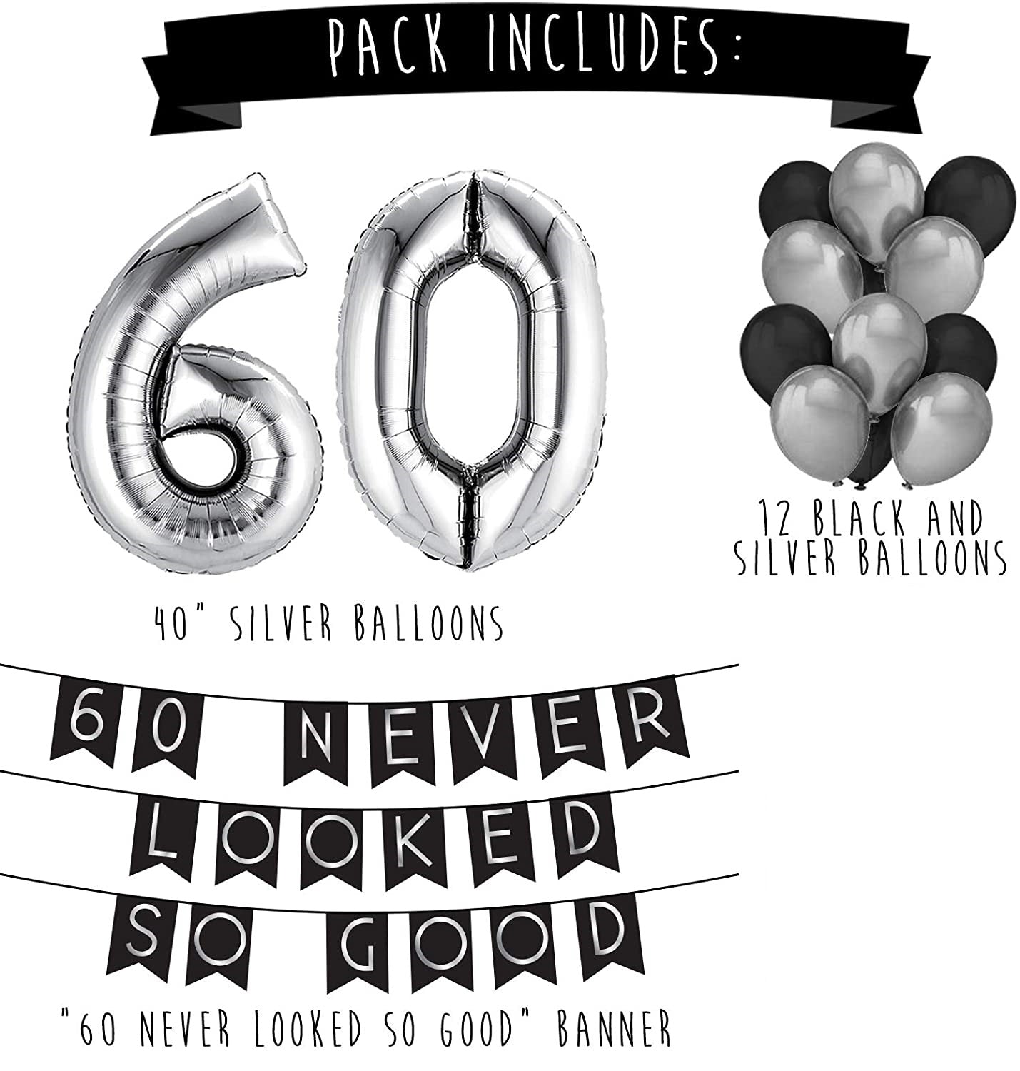 - PACK: Pack includes "60" Silver Balloons (16"), 1 Banner, 6 Black & 6 Silver 9" latex balloons.