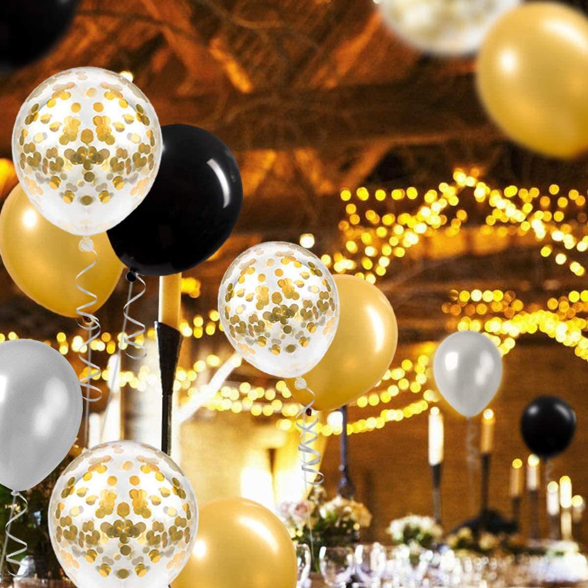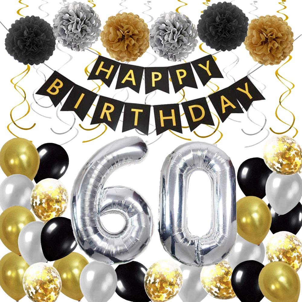 - Great Value Pack -- 1 set "Happy Birthday" letter paper banner, 2 x 16 inch digital "60" silver foil balloons, 6 x 12 inch gold confetti balloons, 18 x 9 inch latex balloons(6 gold, 6 silver, 6 black), 6 x 12 inch paper pompoms(2 gold, 2 silver, 2 black). Easy to use and included everything you'll need to celebrate your birthday party.