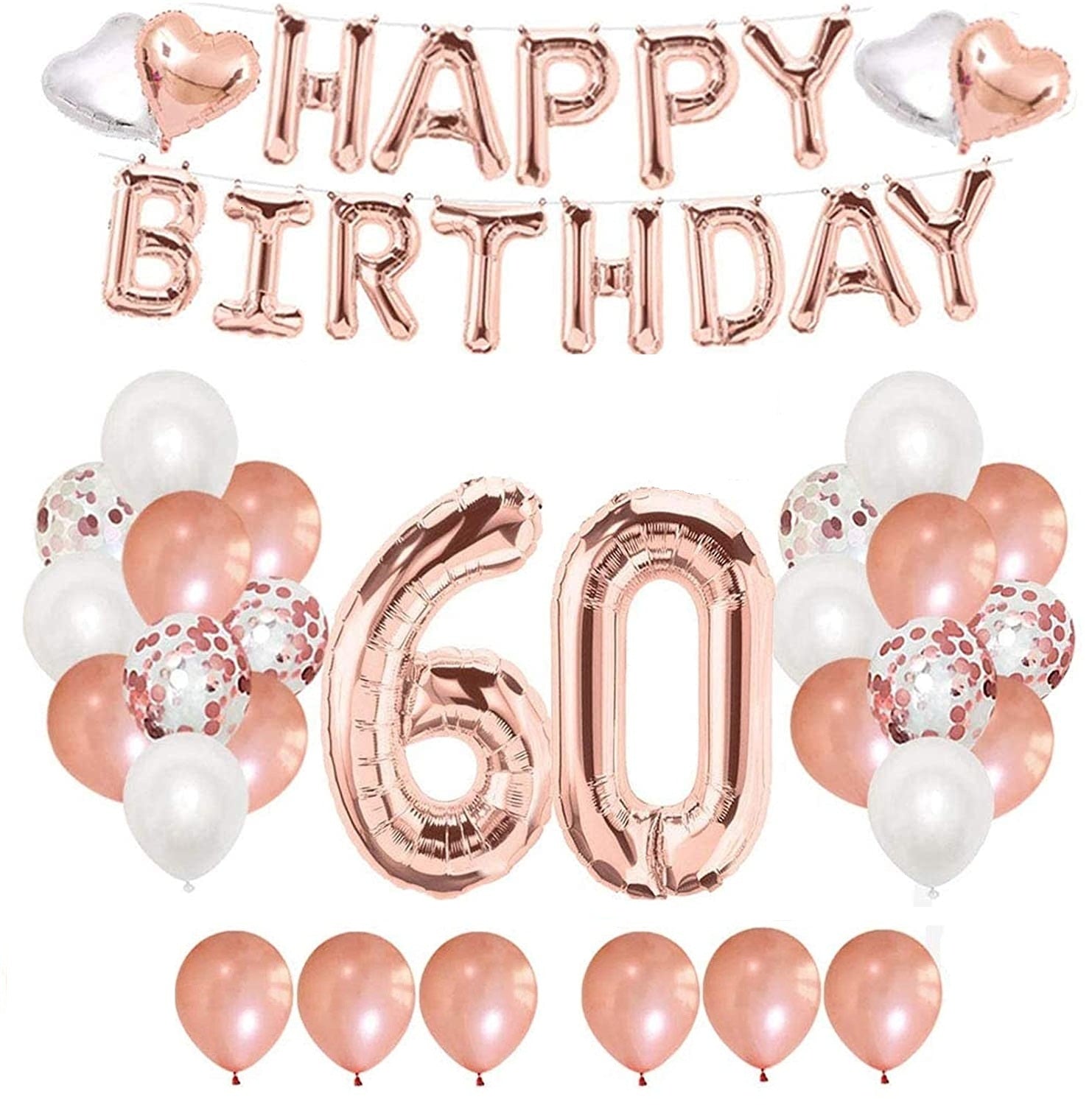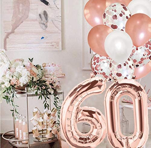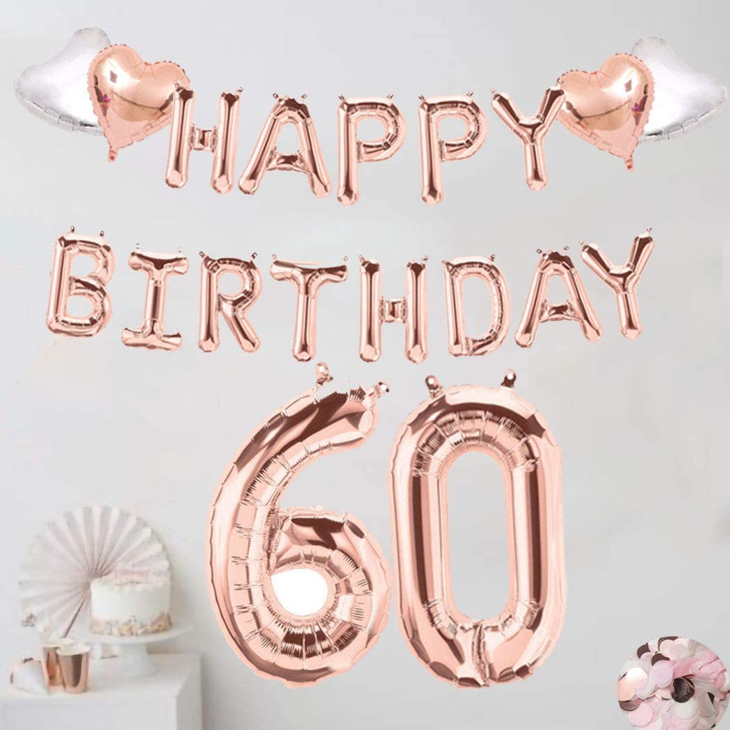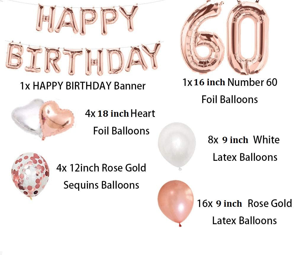 - Package contains: It's designed for your 60th birthday party.Package include foil balloons "HAPPY BIRTHDAY" ,4 pcs heart foil balloons(2 silver ,2 Rose gold ) , 16pcs party latex balloons Rose gold, 8 pcs white balloons, 8 pcs rose gold confetti balloons, foil number balloons 60,