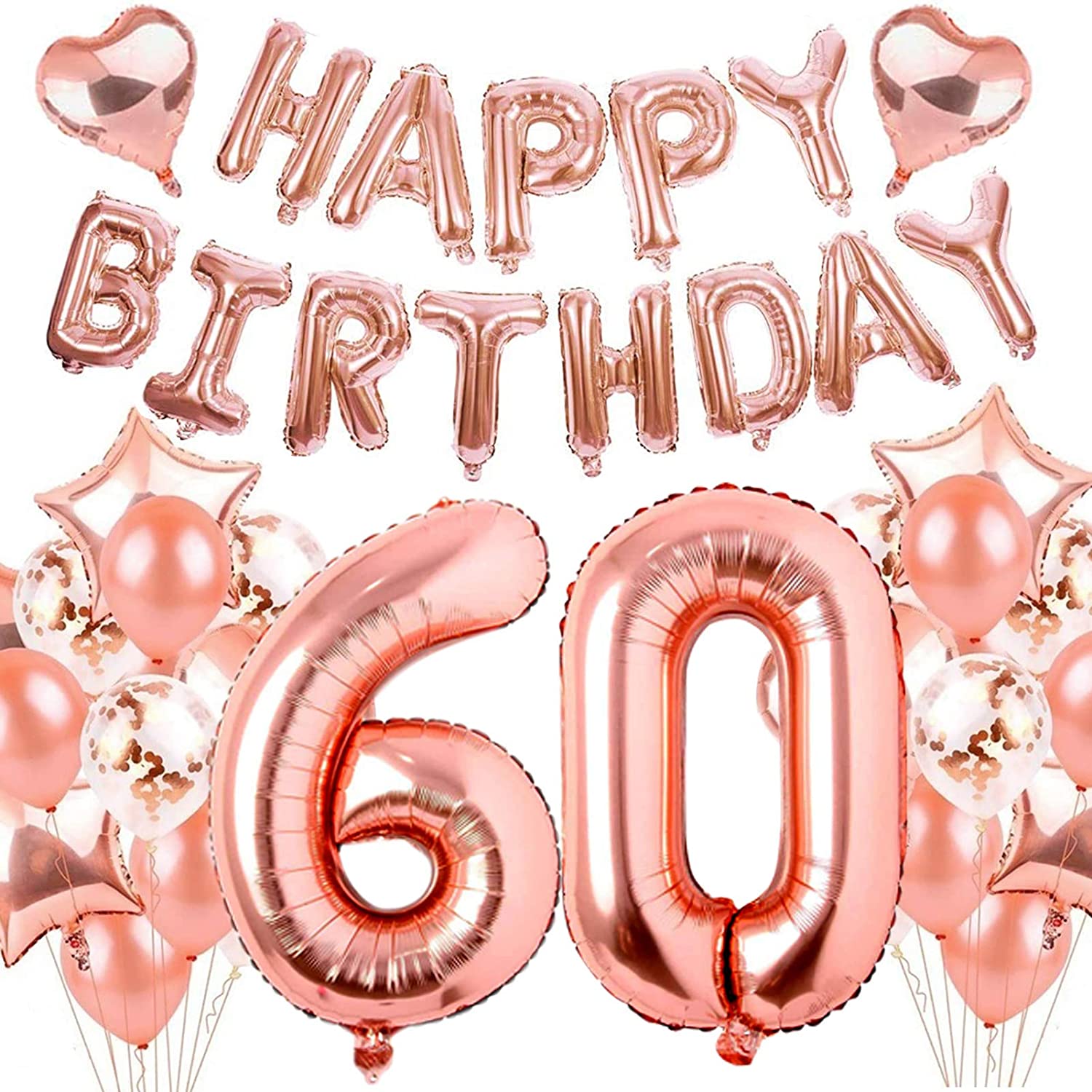 - 60TH BIRTHDAY DECOR - 60th birthday decorations for women includes everything giving you a stress-free solution saving your time and money. Package includes: 1x 16inch "HAPPY BIRTHDAY" Banner, 1x 16inch number 60 rose gold foil balloons, 2x rose gold heart foil balloons, 4x rose gold star foil balloons, 10x rose gold confetti balloons, 15x rose gold latex balloons, 10x white latex balloons.