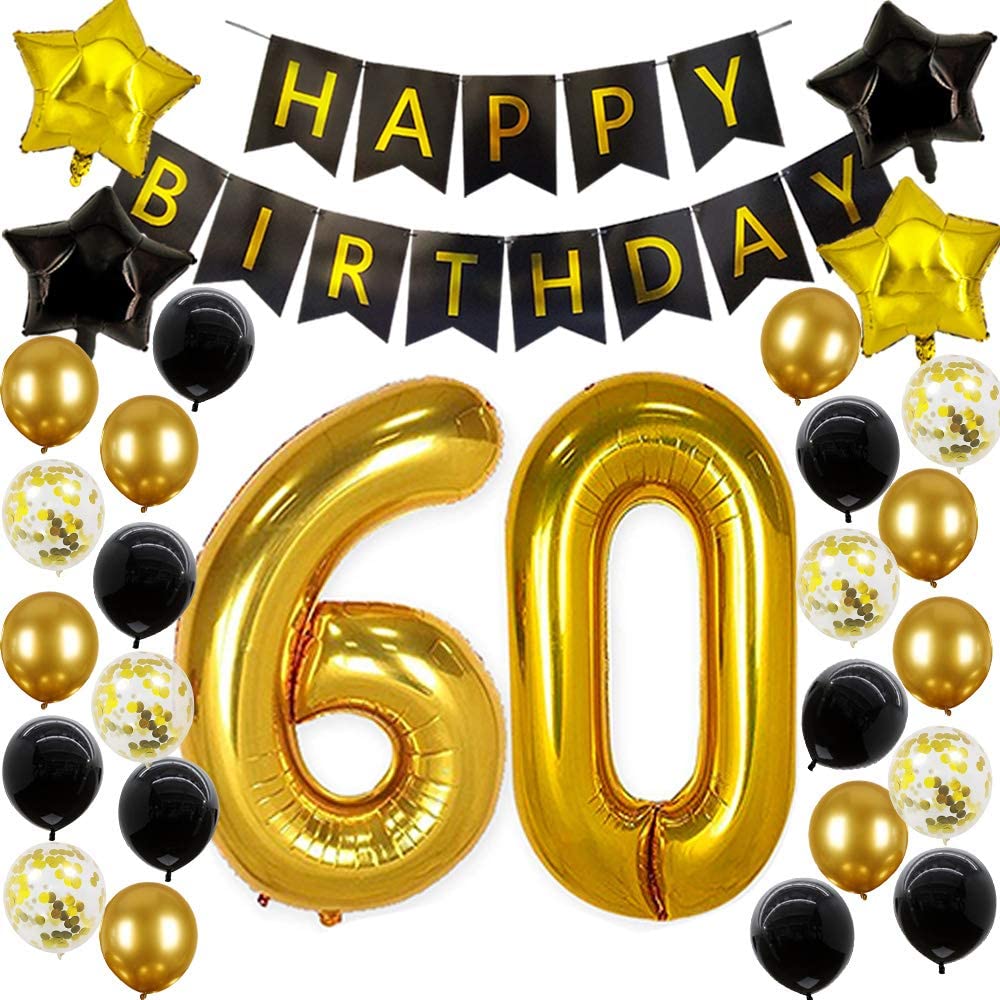 - PACKAGE INCLUD : A large 60 gold number balloons - 16 Inch Each, 1 x black happy birthday banner, 16 x latex gold and black balloons (8pcs each color) - ( Inch Each), 6 x gold confetti balloons - 12 Inch Each,4 x Star Foil balloons - 18 Inch Each for your 60th birthday party decorations