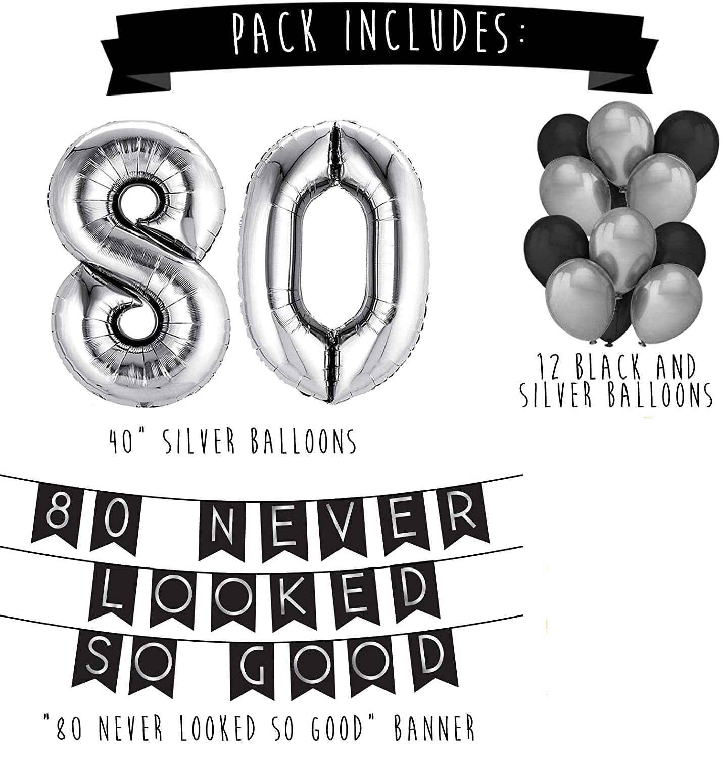 - PACK: Pack includes "80" Silver Balloons (16"), 1 Banner, 6 Black & 6 Silver 9" latex balloons.