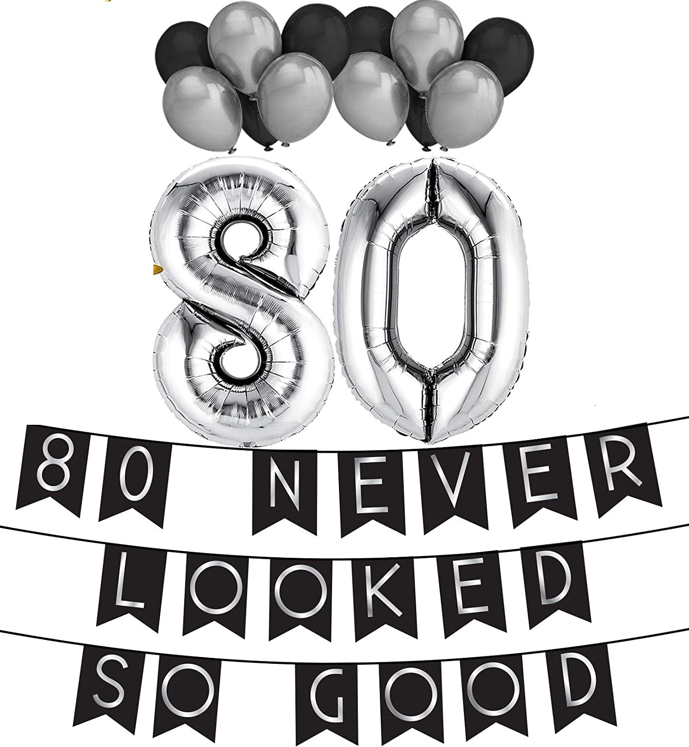 - Who said you have to grow up?! What better way to celebrate your 80th than with our hand strung, premium quality 80 NEVER LOOKED SO GOOD banner, balloon and swirl pack. This pack is the perfect decoration to add a touch of classy decor and welcome your guests to the occasion.