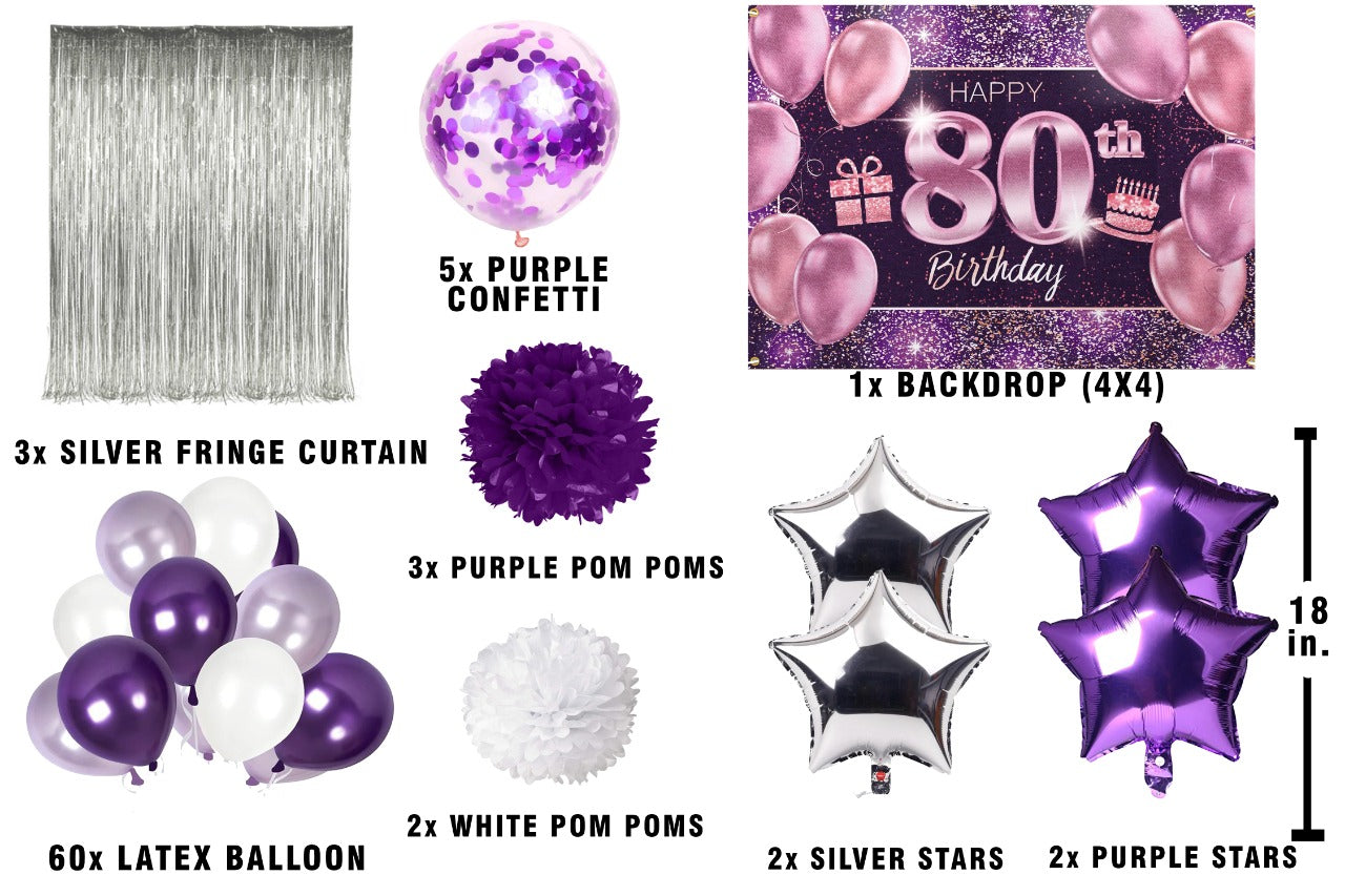 - Package includes - Backdrop-flex material light and thin, Balloons- 60 pcs Metallic 20 pc each green dark green and purple and six pc Pompom (3 pc each Purple and Green) and six pc paper Lantern (3 pc each Purple and Green). All of the kits are useful for 80th Birthday parties.