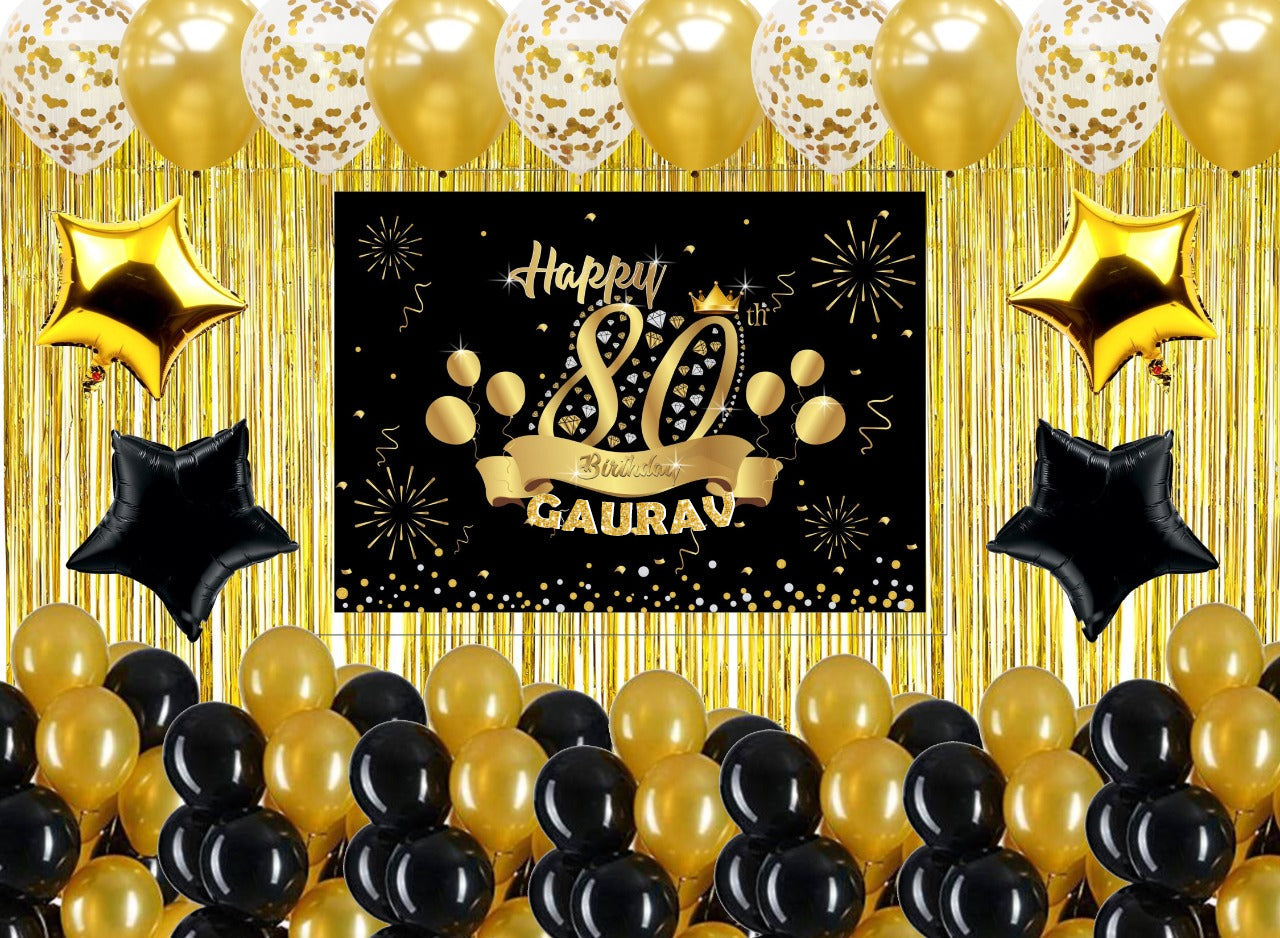 - Package Includes -3 Pcs Gold Fringe Curtains, Backdrop - 4 by 4ft , Balloons- 80 pcs Black & Golden, 5 pc Golden Confetti and 4 pcs (2 pc each Black and Golden Star)