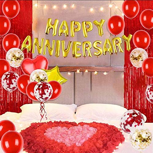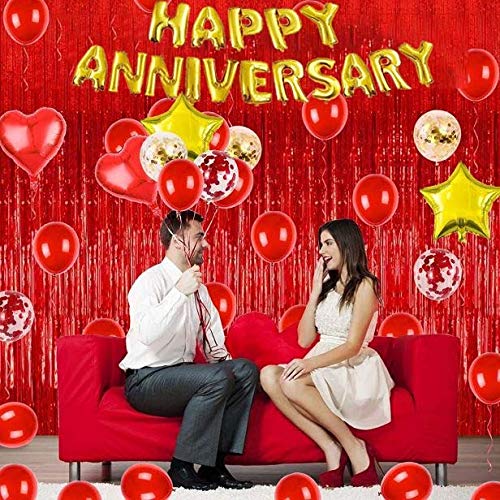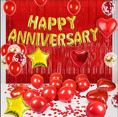 - PERFECT ANNIVERSARY DAY DECORATION KIT - Package contains 1× gold Happy Anniversary foil balloon, 2× red foil curtains, 30× red balloons, 4× heart foil balloons(red/gold), 12× confetti balloons(red/gold).