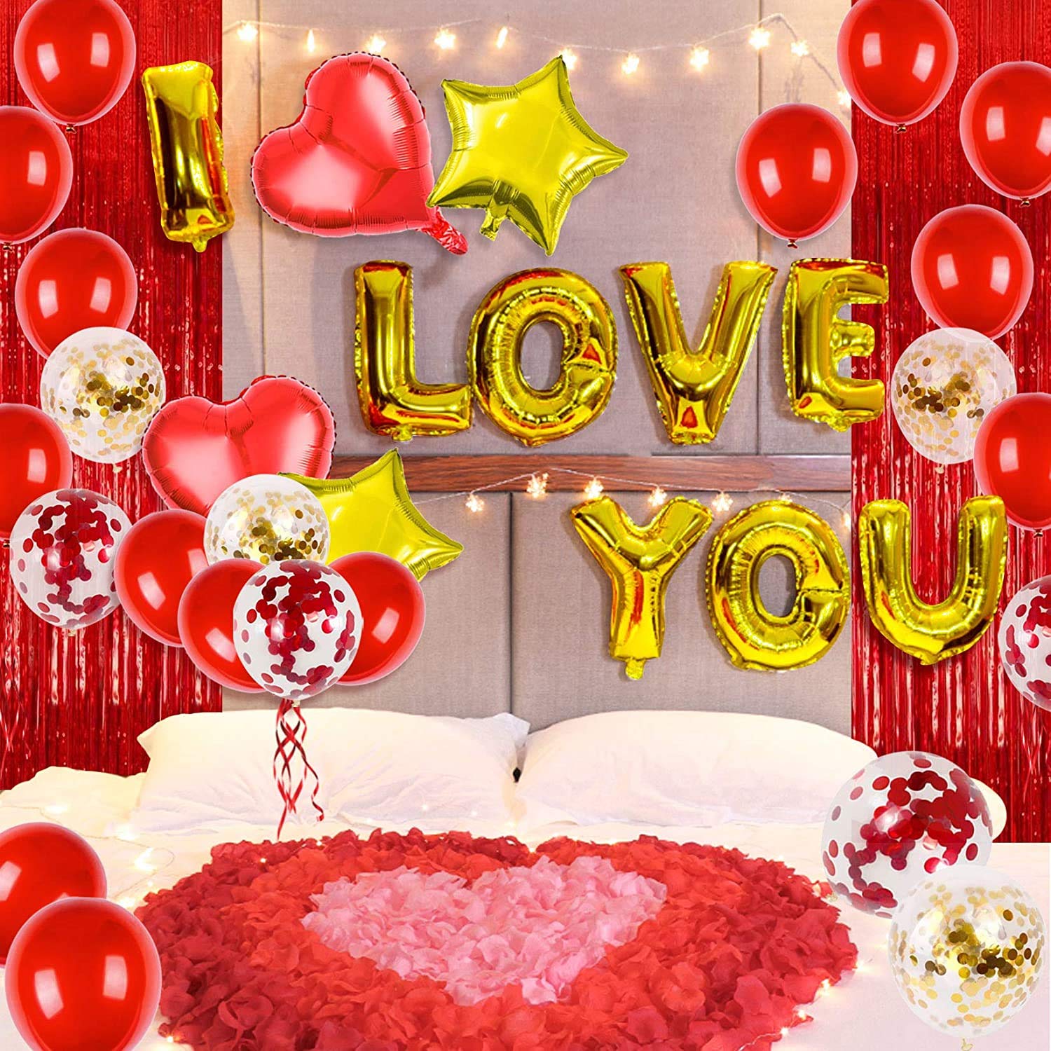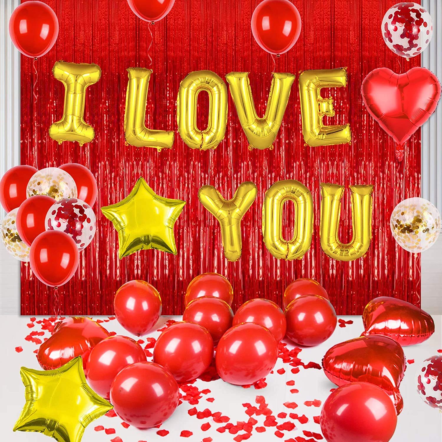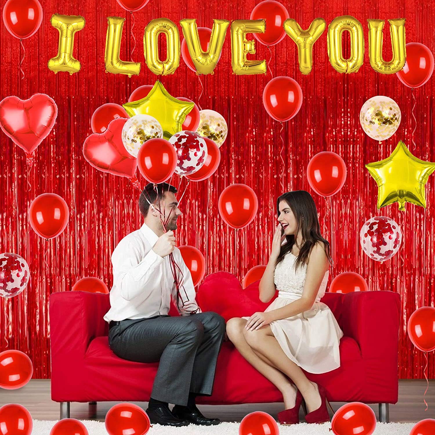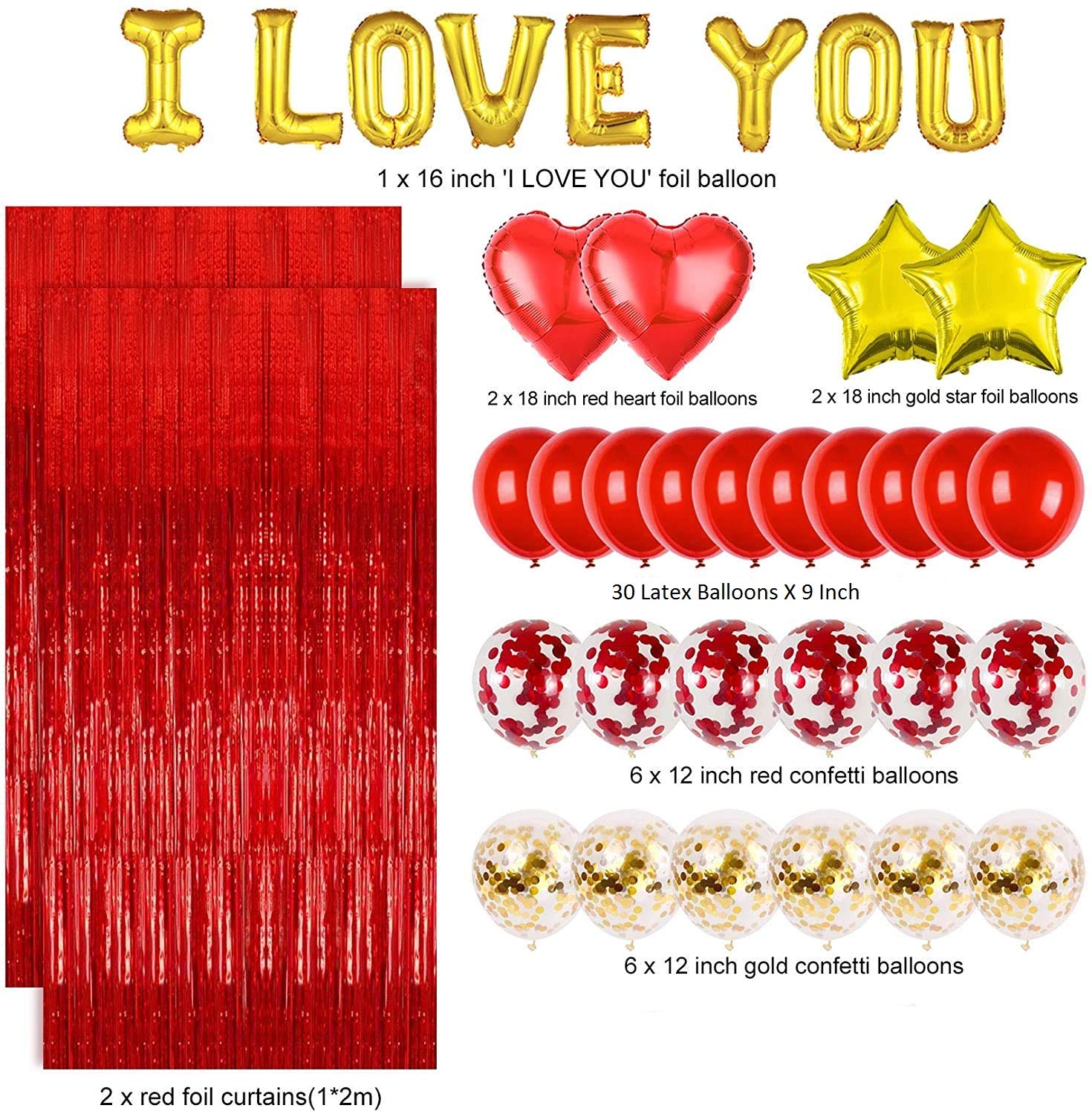 - PERFECT ANNIVERSARY AND VALENTINE DAY DECORATION KIT - Package contains 1× gold I Love You foil balloon, 2× red foil curtains, 30× red balloons, 4× heart foil balloons(red/gold), 12× confetti balloons(red/gold).