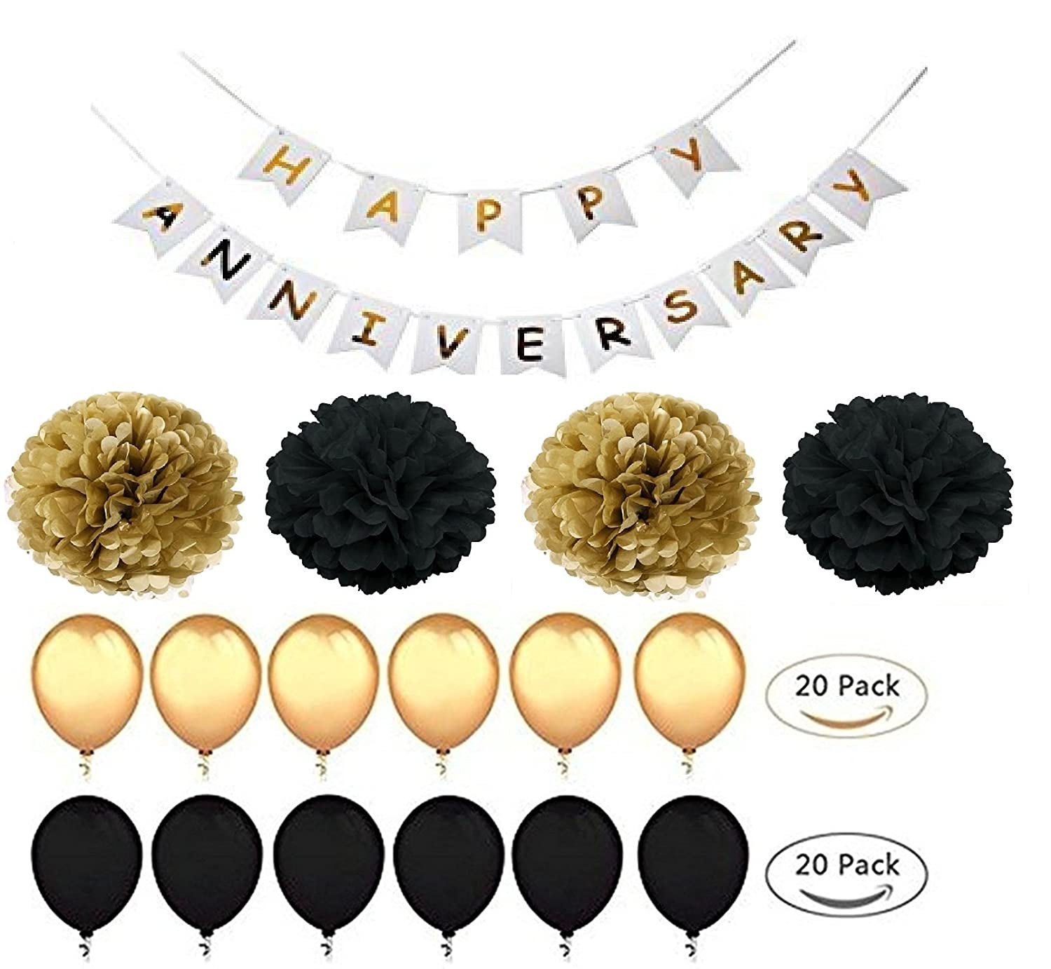 - Package included: 40 Pcs Metallic Balloons (20 Pc Golden + 20 Pcs Black) + 4Pc Fluffy Pom Pom decoration Foil balloons (2 Golden + 2 Black) + Banner Letter (Happy Anniversary banner) .