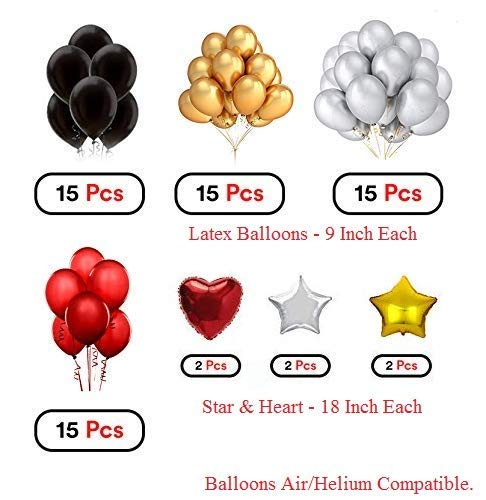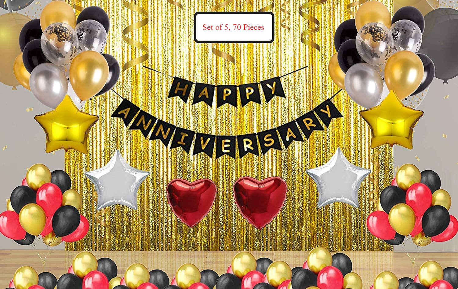 - PACKAGE INCLUDE: Happy Anniversary Banner / Balloons for Party Decorations/Room Decoration (Happy Anniversary) + 3pc Golden Fringe Curtain (3x6 Feet) + HD Metallic Balloons (Black, Red,Gold and Silver) Pack of 60 + 4 Star Balloon(Silver,Gold) + 2 Heart Balloon(Red).