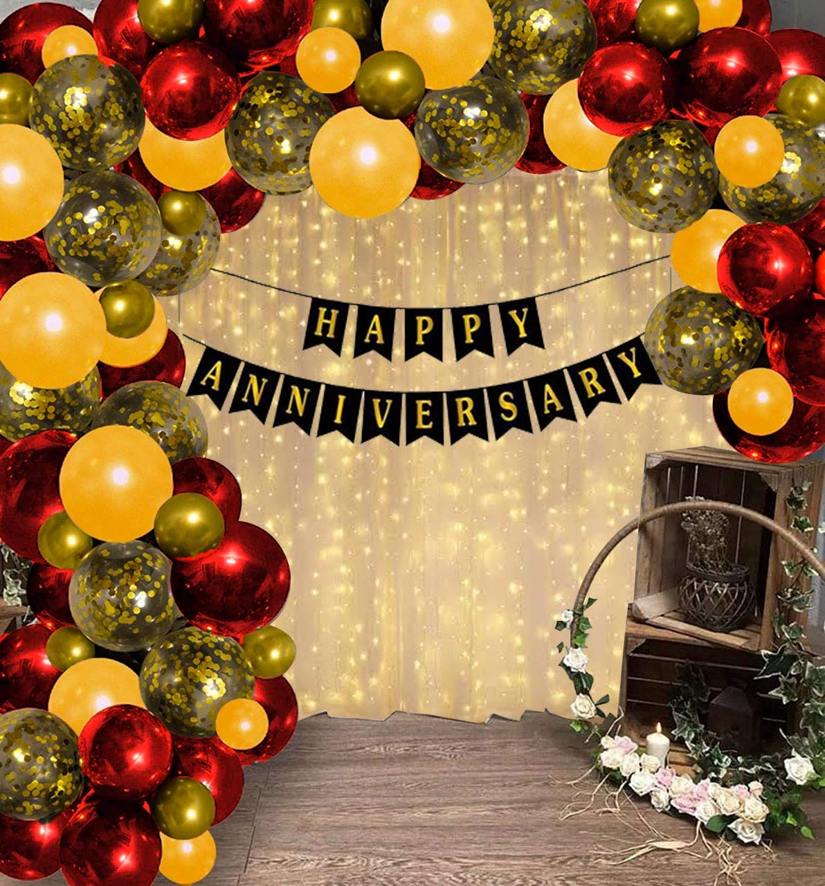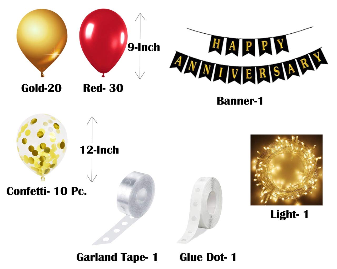 - This special anniversary set Packet includes: Package include 1 pc black happy anniversary banner, 60 pcs white golden black metallic balloons (30 Gold, 30 Red), 10 Piece Gold Confetti - 12 Inch each, 1 pc led light, 1 pc garland strip and 1 pc glue dot.