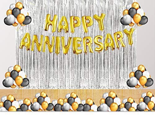 - Happy Anniversary Letter Foil Balloon Set of Gold + 2 Pcs Silver Fringe Curtain (3 X 6 Feet) + Pack of 50 Pcs Metallic Balloons (Black, Gold and Silver) Ship Non inflated, Height of each letter is approx 16 inches and can cover wall space of about 20 sq. Feet Suitable for anniversary theme party decorations and anniversary party supplies
