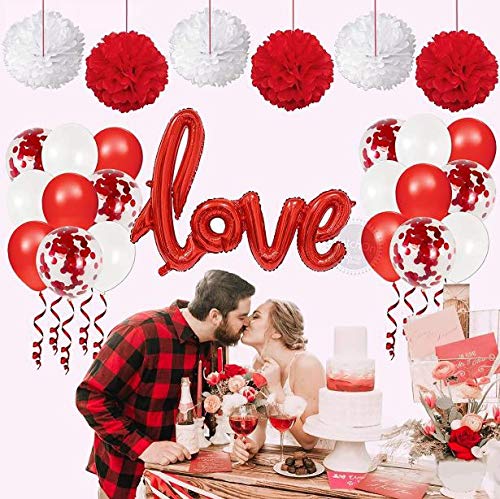 - This special anniversary set Packet includes: One Piece love letter balloons, 7 Red, 7 White and 7 Red confetti balloons along with 3 pompom red and 3 pompom white - 12 inch each.