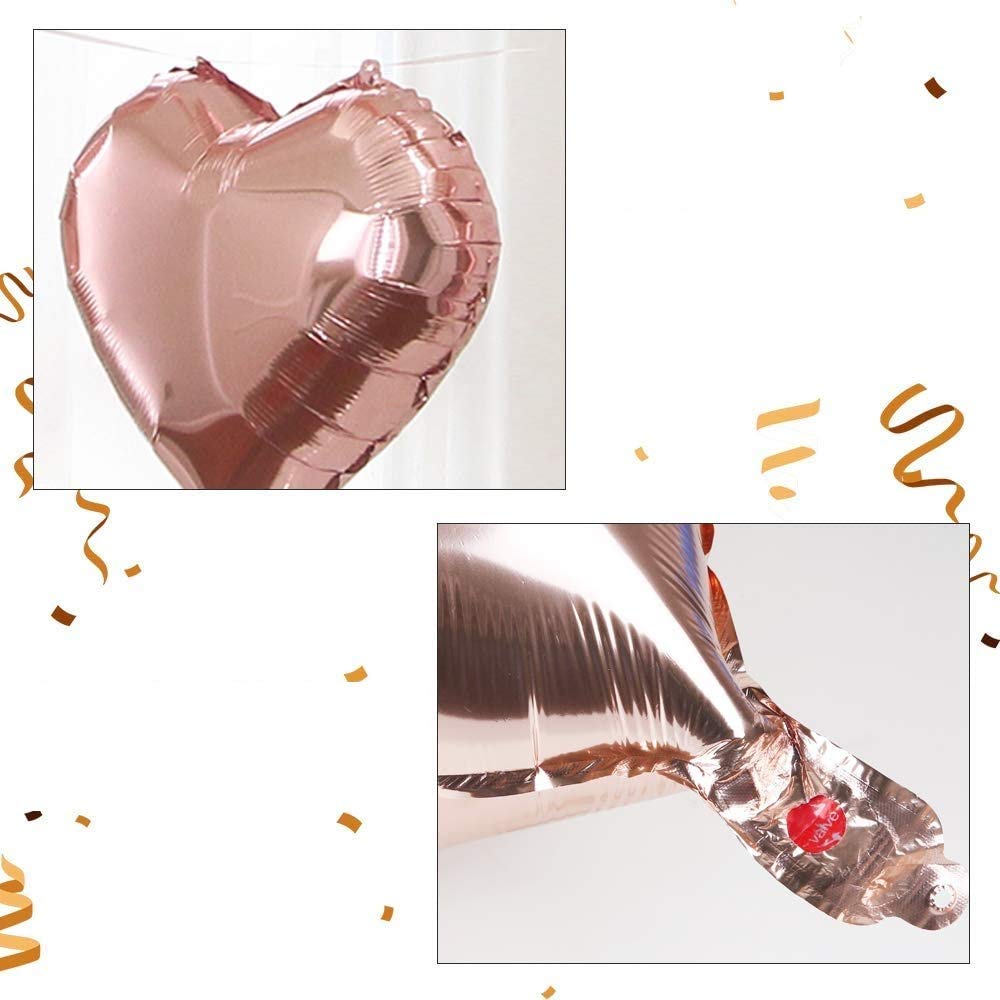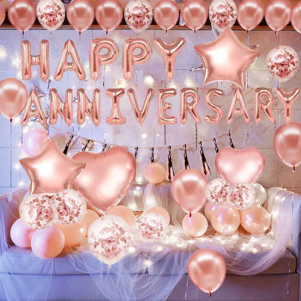 - This special anniversary set Packet includes: Rose gold party decoration contains: 18 inches rose gold five-pointed star x 2, 18 Inch Heart Foil balloons x 2, 16 inches Happy anniversary balloons x 1, 12 inches pre filled confetti balloons x 8, 9 inch latex balloon, 30 ft Long led strip light X 1