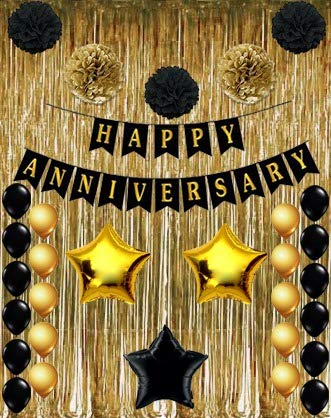 - The set of happy anniversary banner, fluffy paper pom poms, gold foil curtain, gold and black latex balloons and gold foil star balloons will decor your anniversary party beautiful and impressive