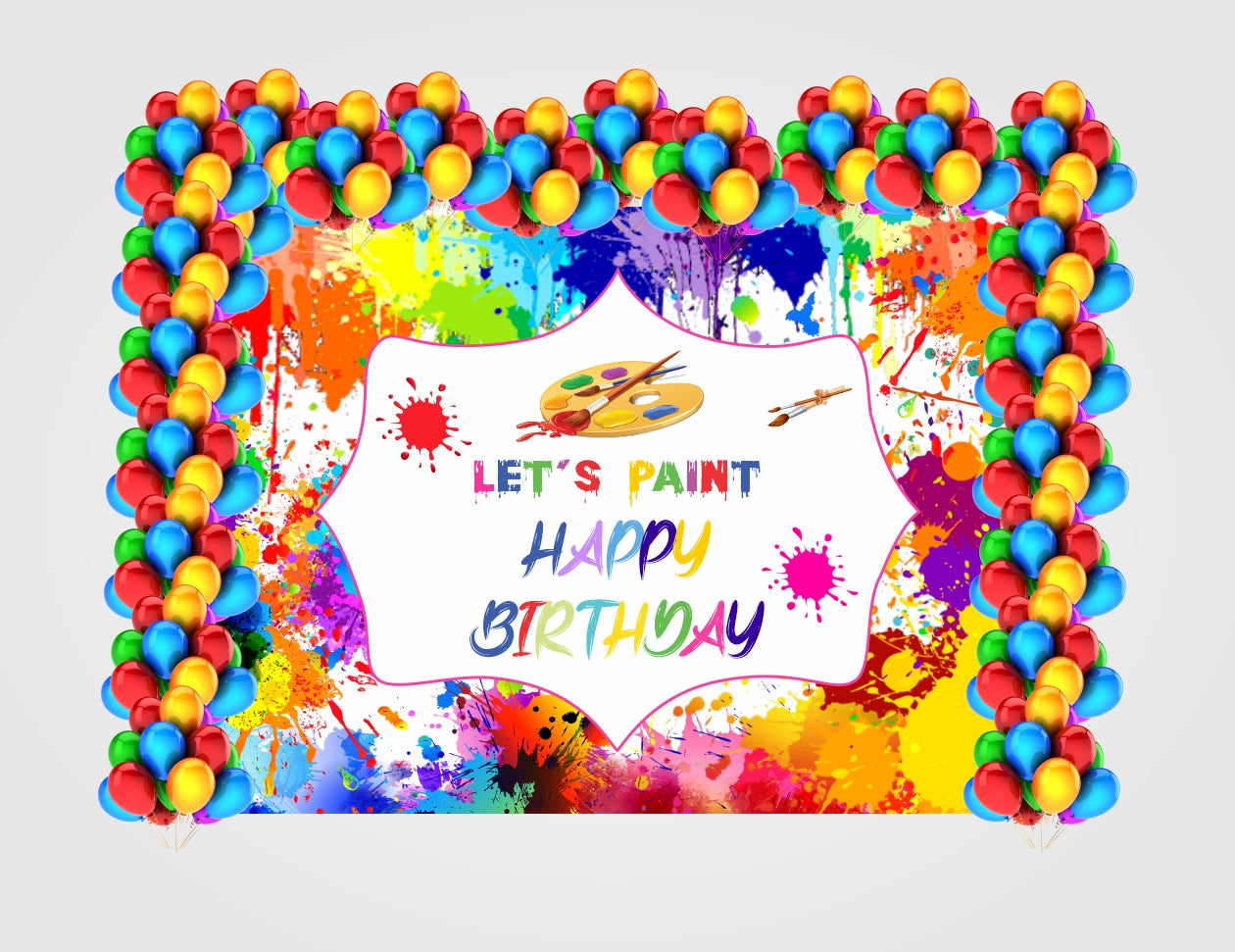 Package Includes - Art and Paint Birthday Theme Backdrop & Balloons. Total 50 balloons, 10 each -Green, Yellow, Red, Purple and Blue.