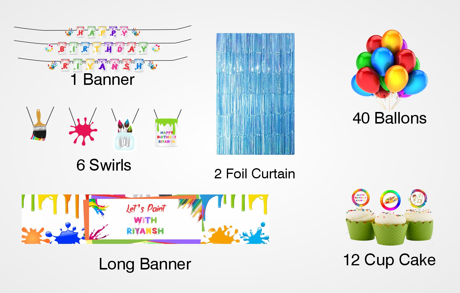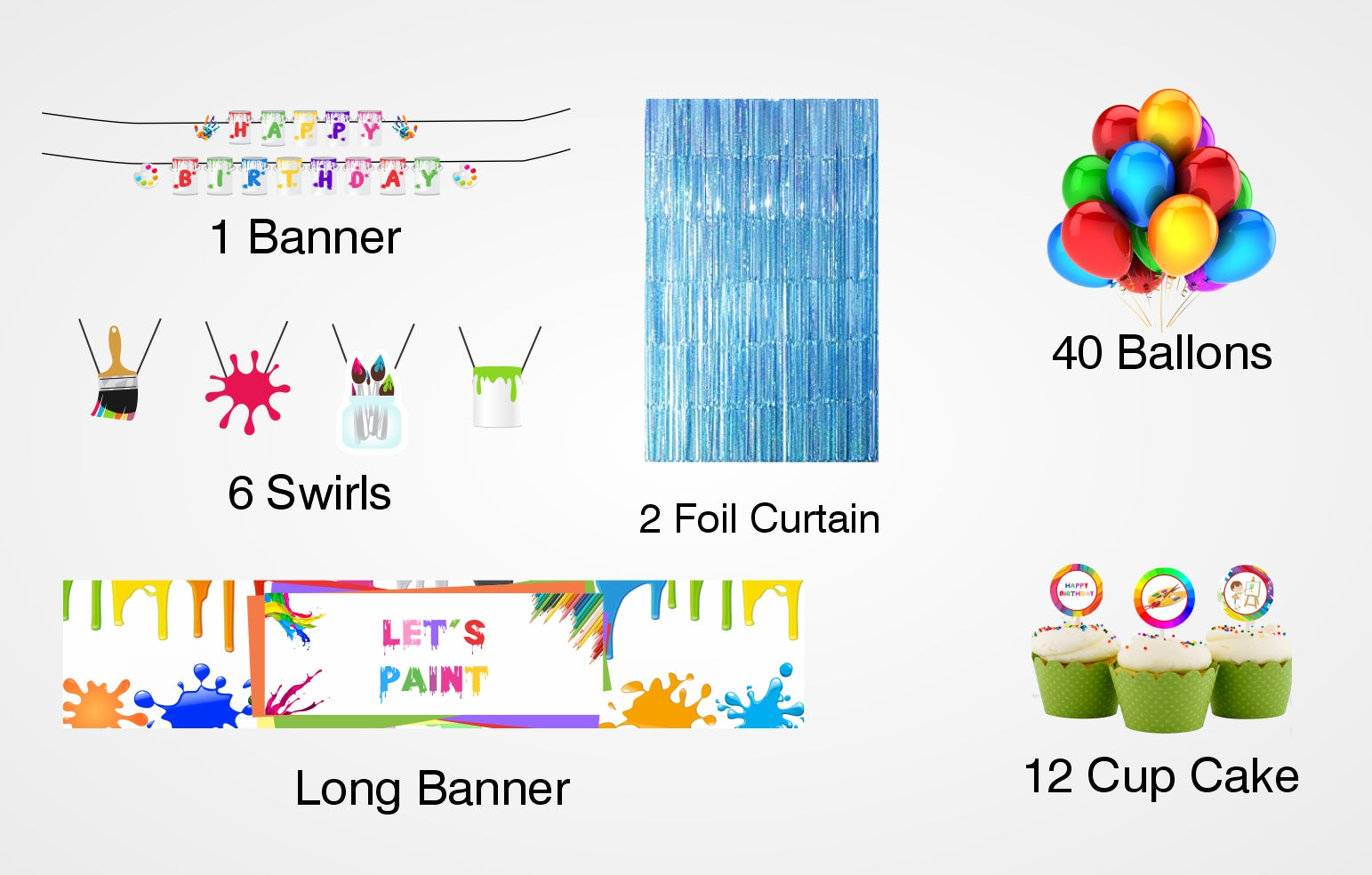 - Material -2 Foil Curtain -6 by 3 (height and width) shiny foil, long banner vinyl material, and size approx. Five by 1, Happy birthday banner, Cupcake Topper & Hangings are made up of stiff paper. Tools like ribbon, glue dot, and swirls send along with it. Little assembly required.