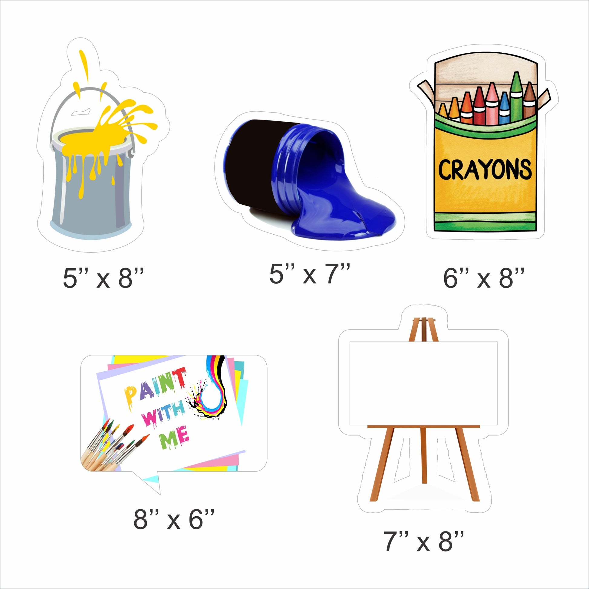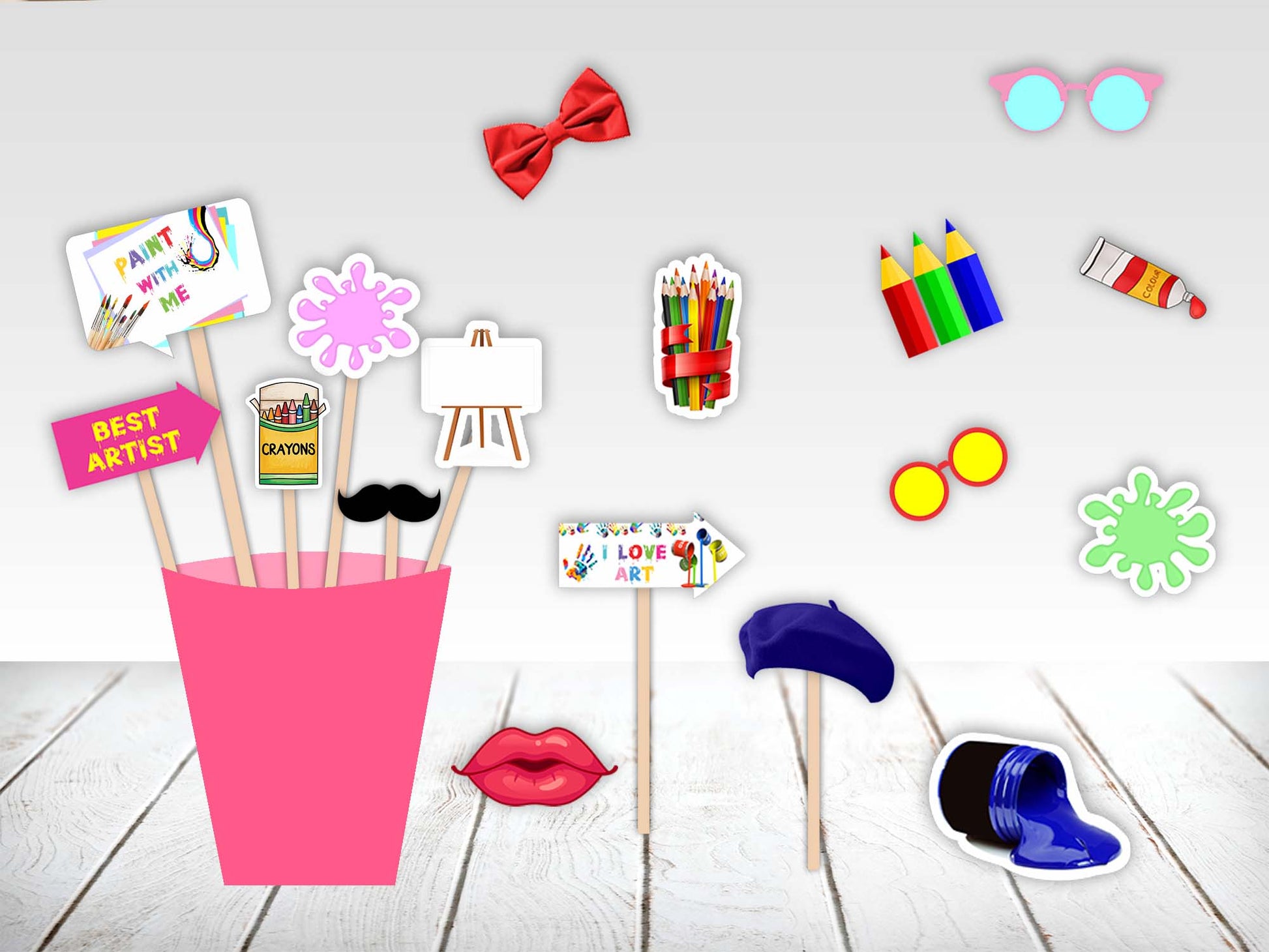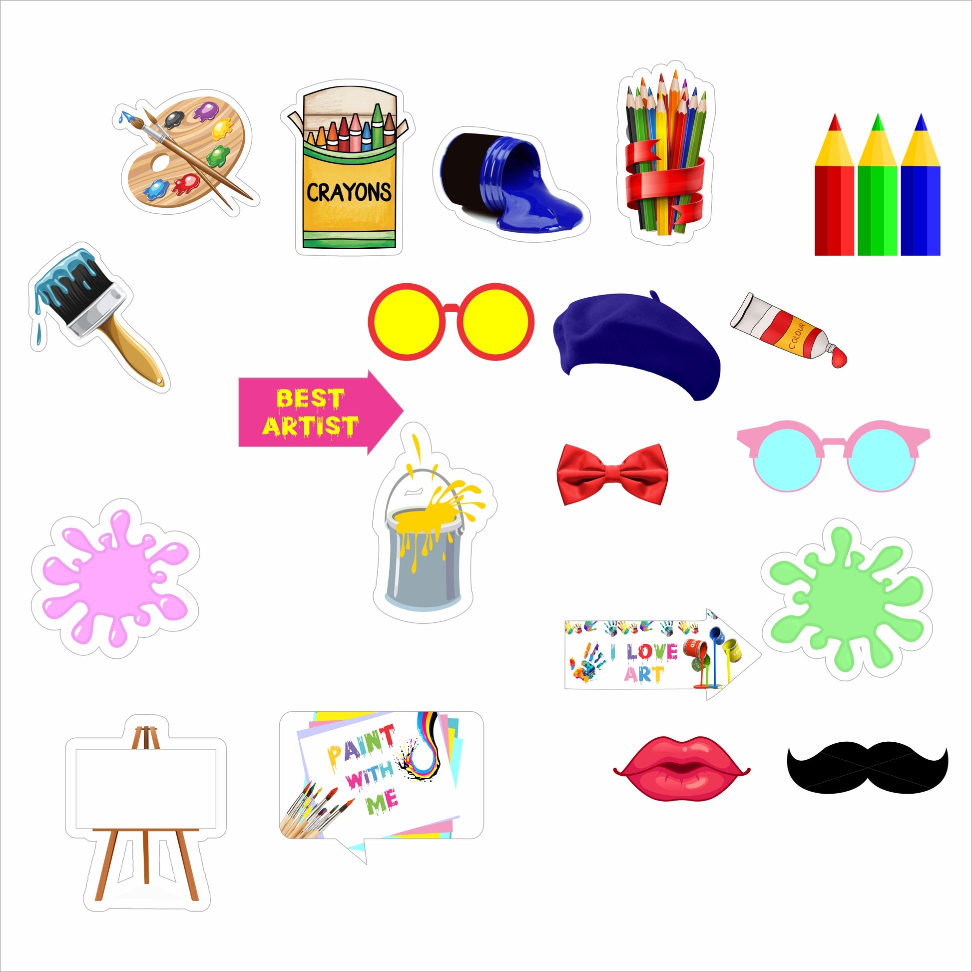 - Art and Paint Theme photo prop pack accompanies 20 pieces and will add fun for kids and adults. Take entertaining party photos while making memories with these photo booth props. Everyone will adore the fun photographs they will take with these excellent props.