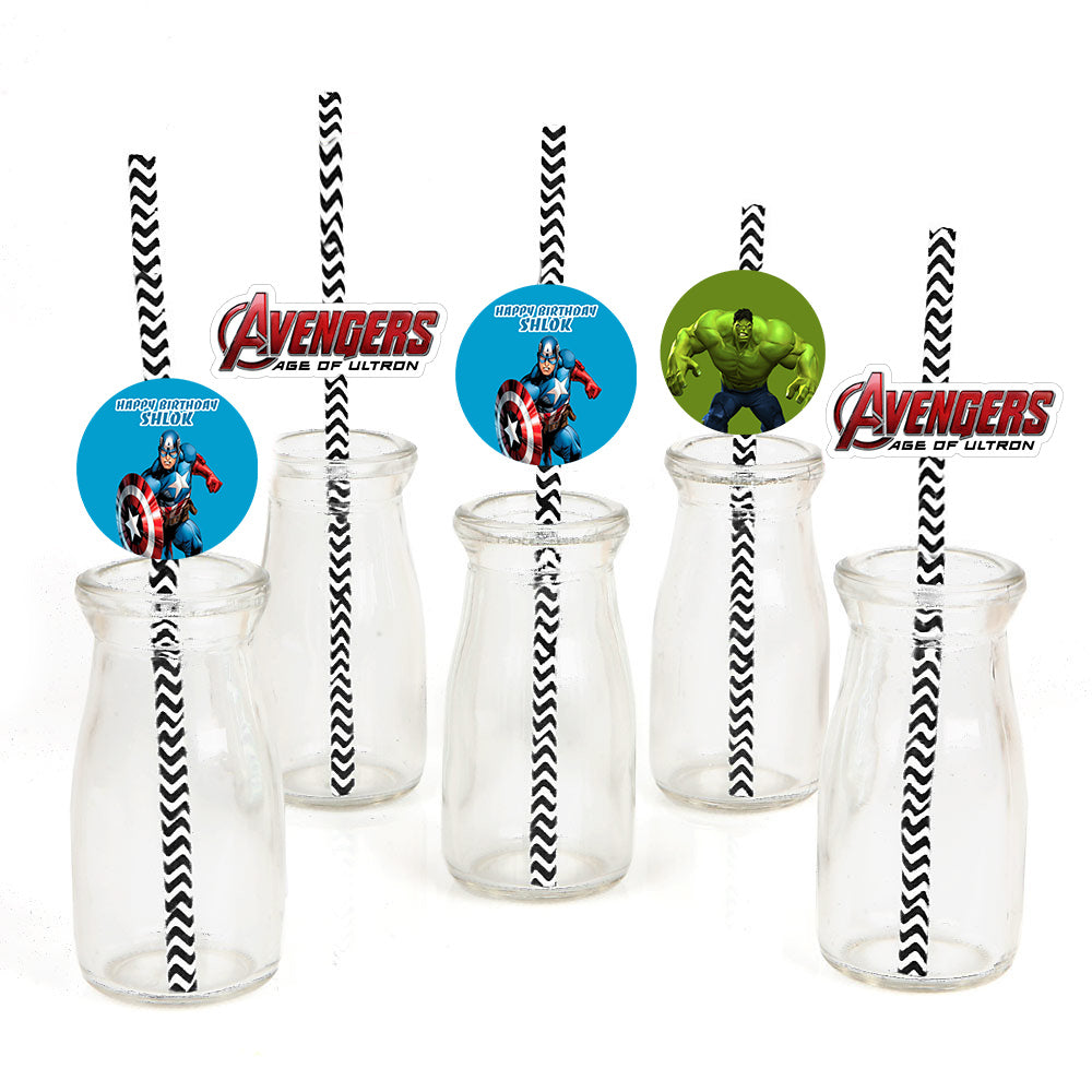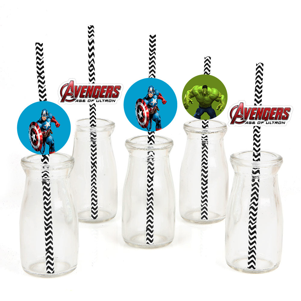 - The package includes - 24 avenger theme paper cut-outs, 24 coordinating paper straws & a glue dot.