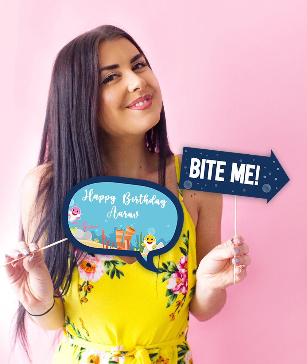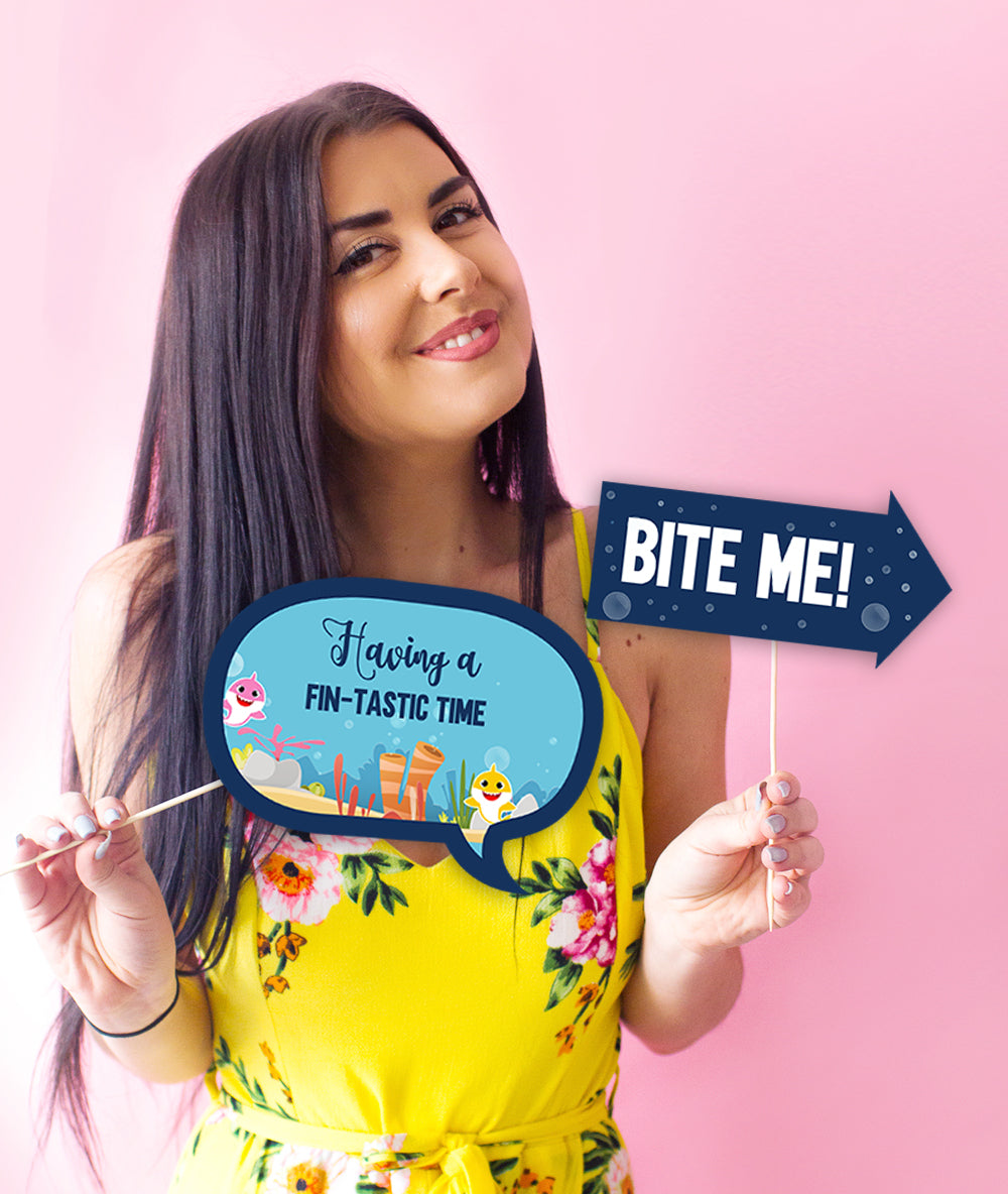 Baby Shark Theme photo prop pack accompanies ten pieces and will add fun for kids and adults. Take entertaining party photos while making memories with these photo booth props. Everyone will adore the fun photographs they will make with these excellent props.