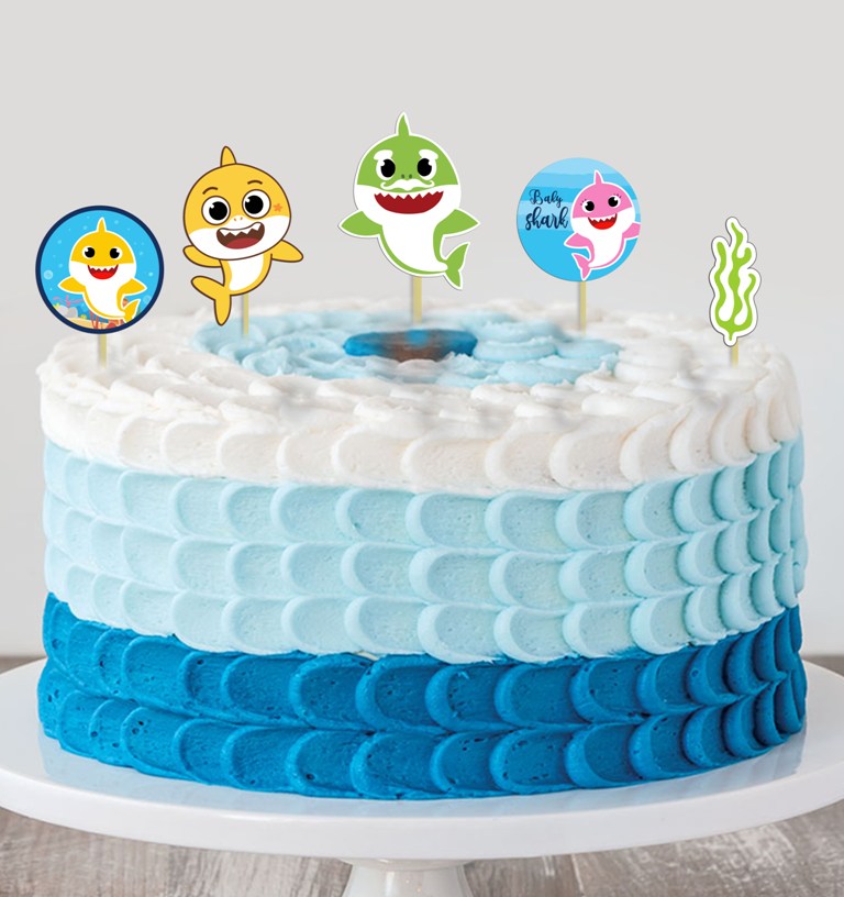 - How to use: - Include Baby Shark Theme Cake toppers to your treat table to make an extraordinary theme cake show. Style the big cake topper with the two huge picks and add one small selection to each of the ten cut-out shapes to finish the cake embellishment.