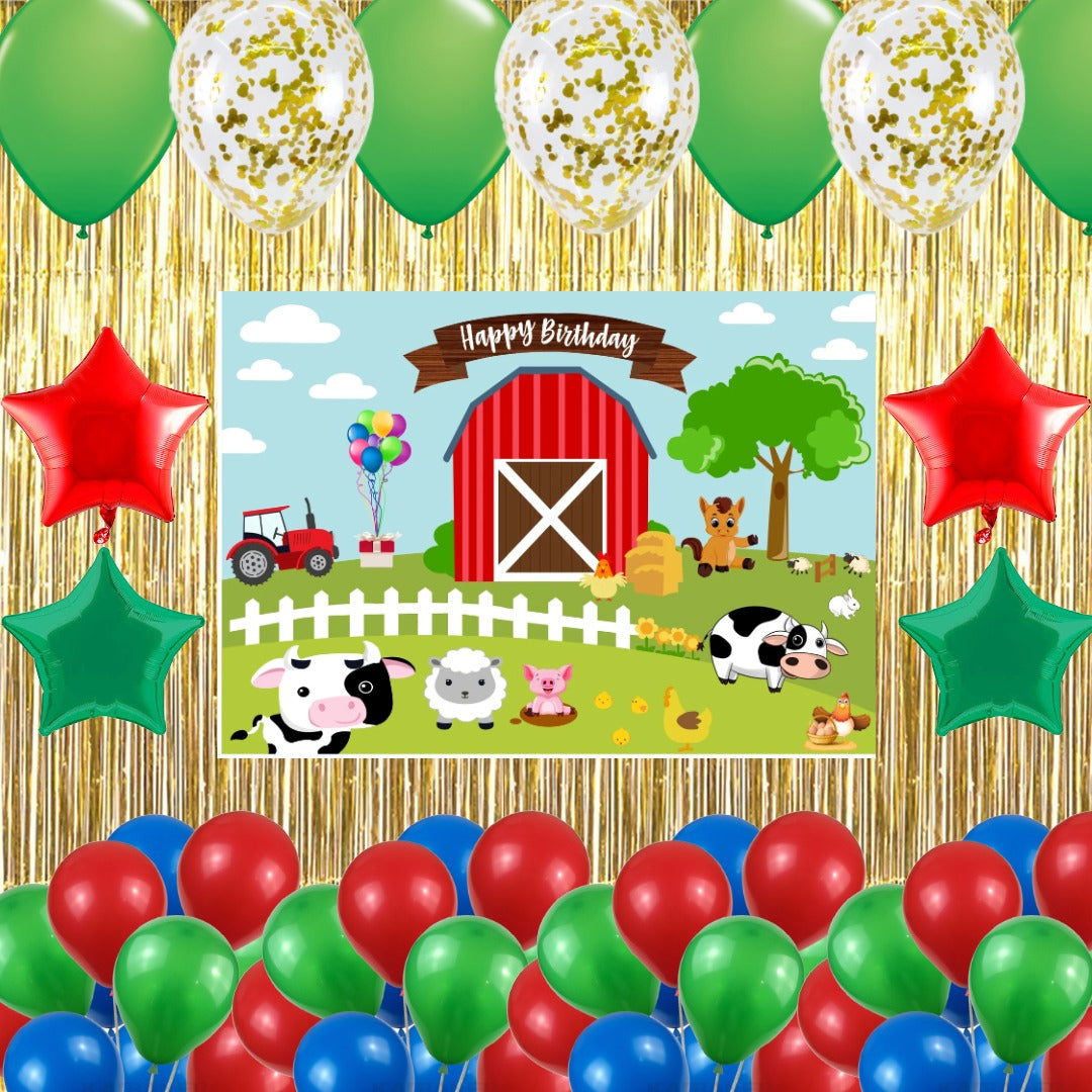 - Package Includes -2pcs gold Fringe curtains; 1 birthday backdrop- Size 4 by 4 ft, 60 pc latex balloons (Red + green +blue Balloons - 15 each); 5 pc Gold Confetti , 4 pcs - 2 green and 2 red star foil Balloons- 18 inch.