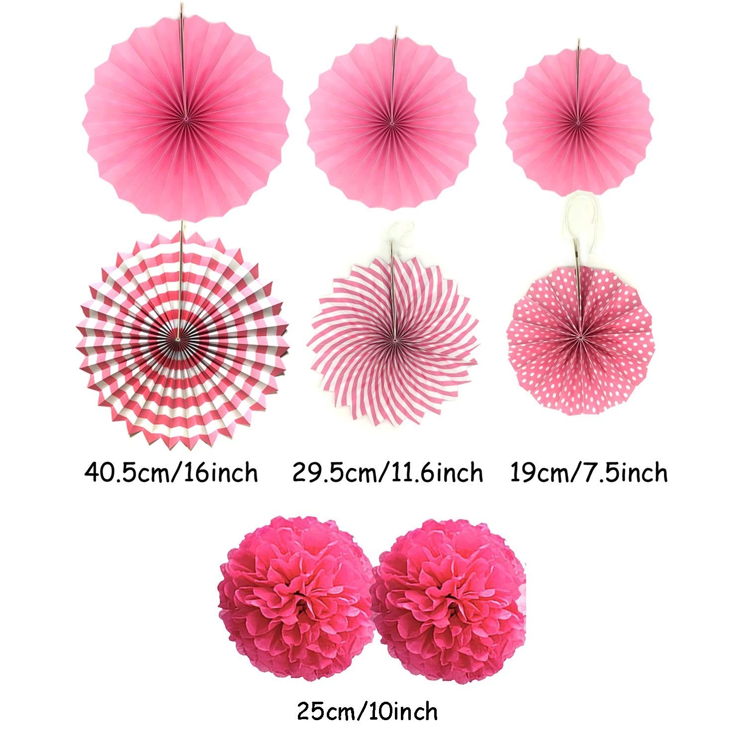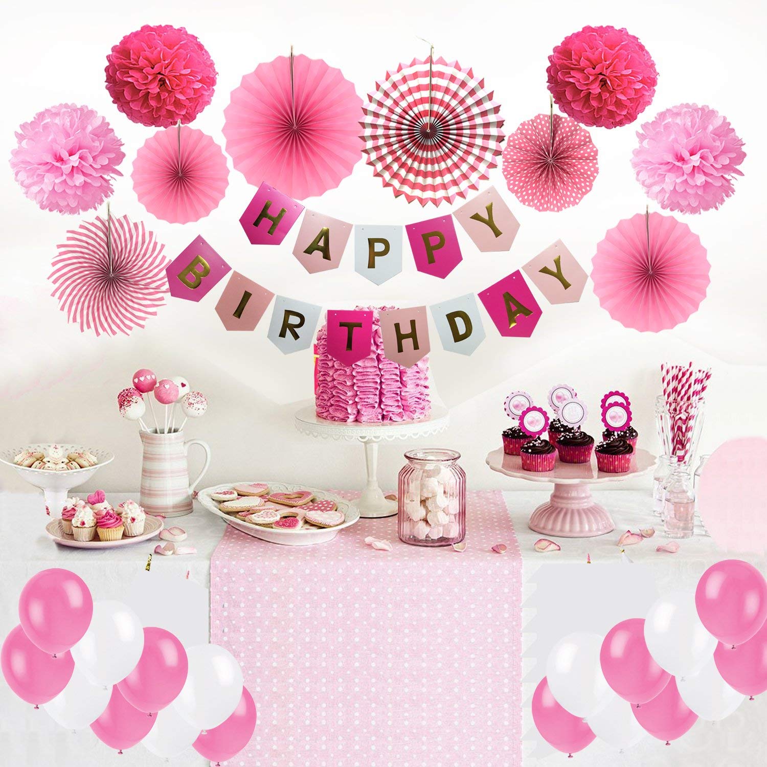 - Includes: 13 pink flags band ("HAPPY BIRTHDAY") , 2 x pink paper pompoms, 2 x white paper pompom, 6 x pink paper fans, 10 x pink balloons and 10 x white balloons birthday party supplies.