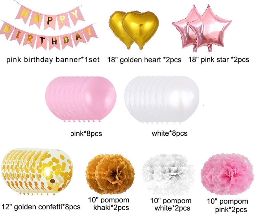 - ❤[Pack including]: Decoration party kits girl.It comes with latex balloons in Pink & white color (8pcs each color);8pcs gold Sequined latex balloon;2 pcs pink Star Foil balloons; 2 pcs gold Heart Foil balloons; paper Pom Pom in white & pink & Khaki(2pcs each color)1 set happy birthday banner.