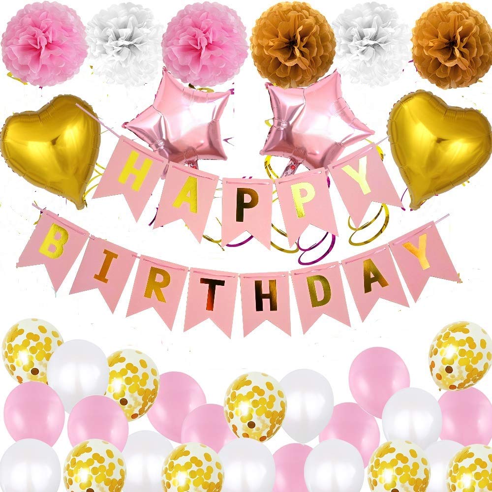Pink And Gold Birthday Decorations -Happy Birthday Banner, Balloons, Pom Poms,Star And Heart Foil Balloons