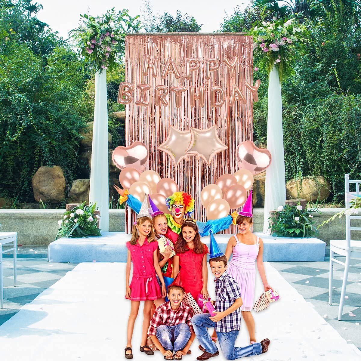 - VALUE PACK - 1PC Metallic rose gold foil fringe curtains, 1pc Rose gold "HAPPY BIRTHDAY" balloons banner, 10 pcs 9" rose gold and 10 pcs 9"gold latex balloons, 10pcs rose gold confetti balloons,4 foil heart/star shape balloons.