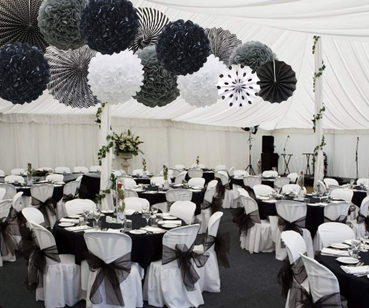 Black Hanging Paper Party Decorations,-Round Paper Fans Set Paper Pom Poms Flowers For Birthday/ Wedding /Baby Shower
