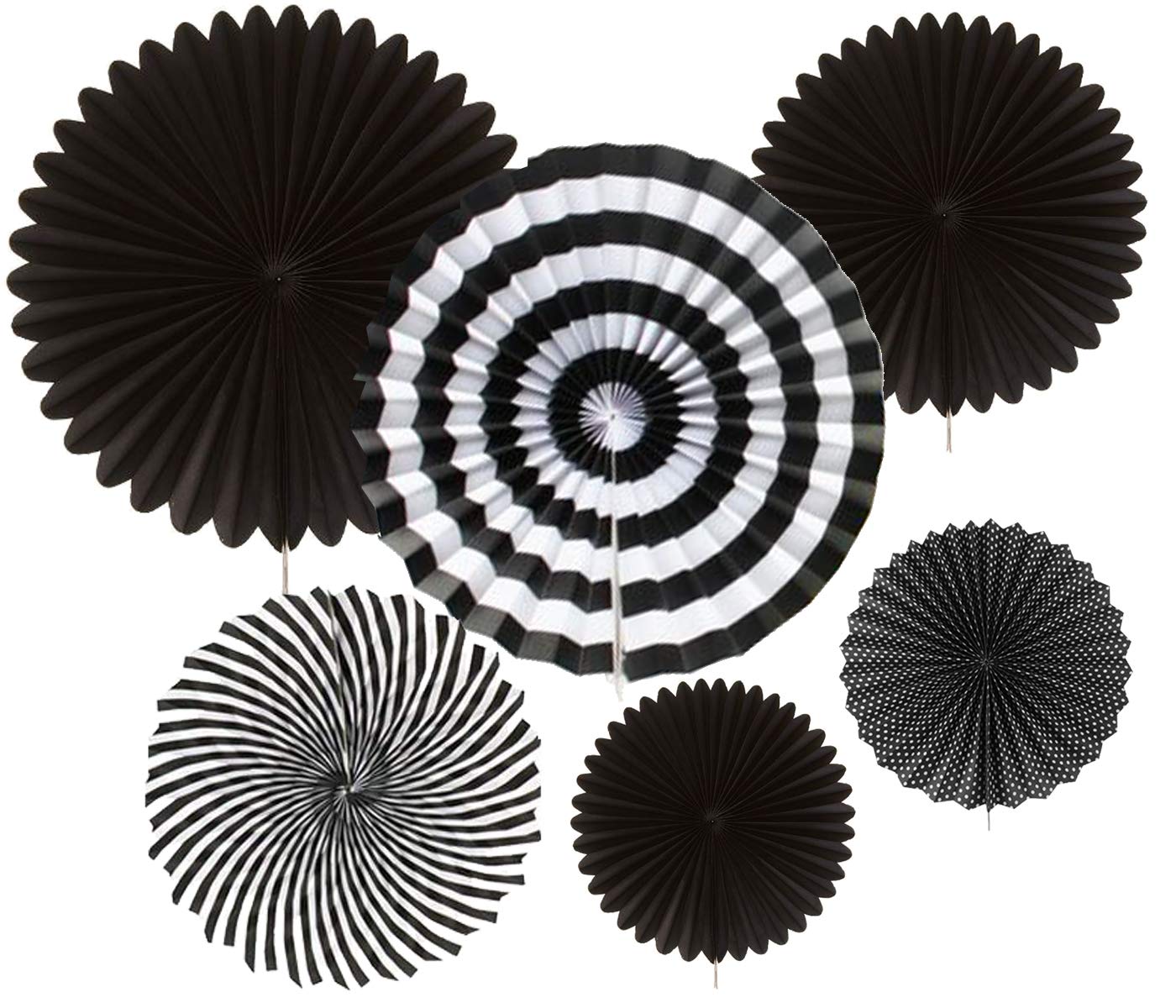 6 different sizes hanging paper fans (Diameter: 8 inch*2/ 12 inch*2 / 16 inch*2), Colorful tissue paper pom poms flowers decoration comes with 6 pc 2 each in black,silver and white