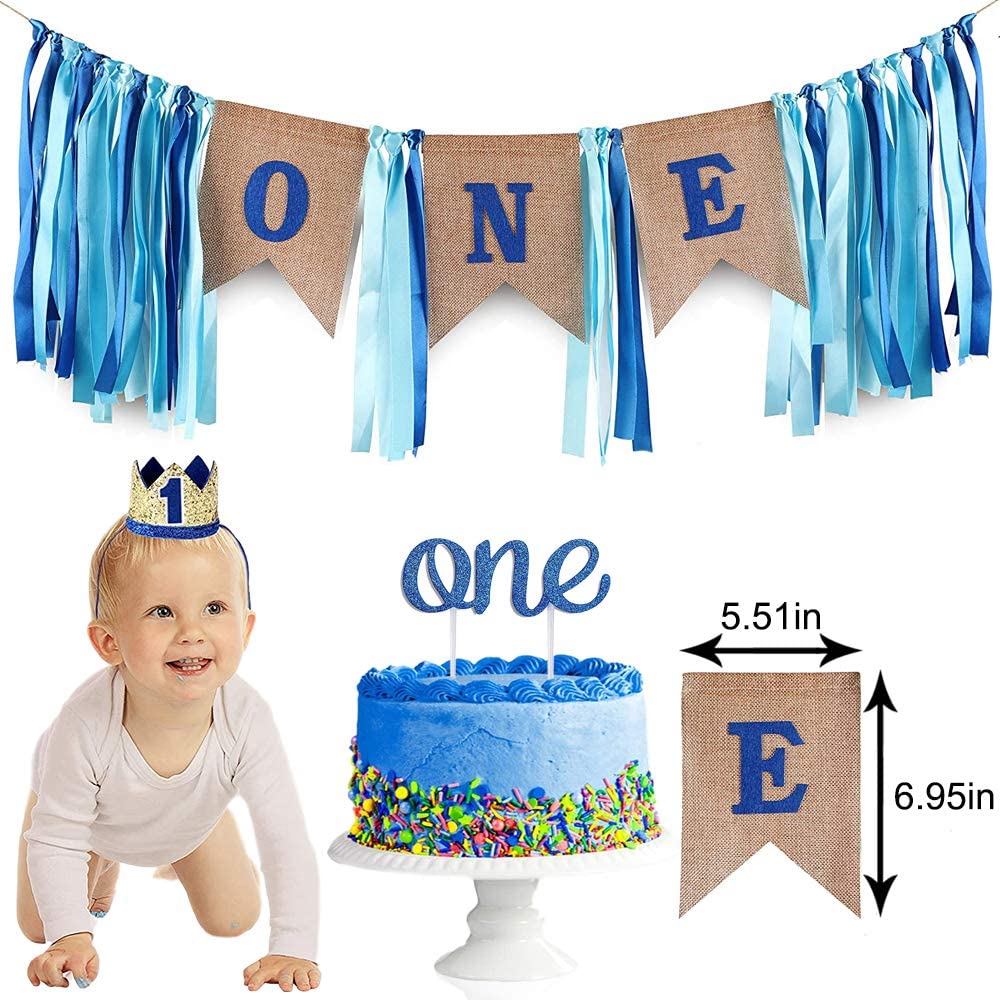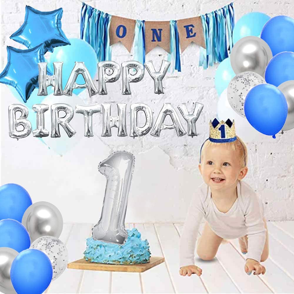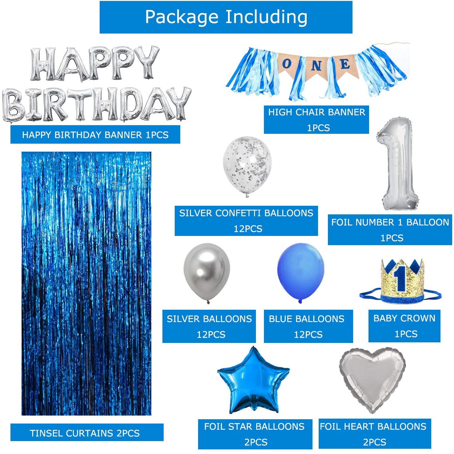 - Happy Birthday Decorations Kit 59 Pcs-Package include 1pc-13 pc silver happy birthday foil , 1pc number one silver foil balloon, 24 -pc blue and silver balloons latex balloons, 12 pc Blue Confetti balloons ,2 pc Blue curtain , 2 pc Silver heart and 2 Blue Star , 1 Burlap Banner and 1 Crown Cap , One cake topper for first birthday birthday decorations .