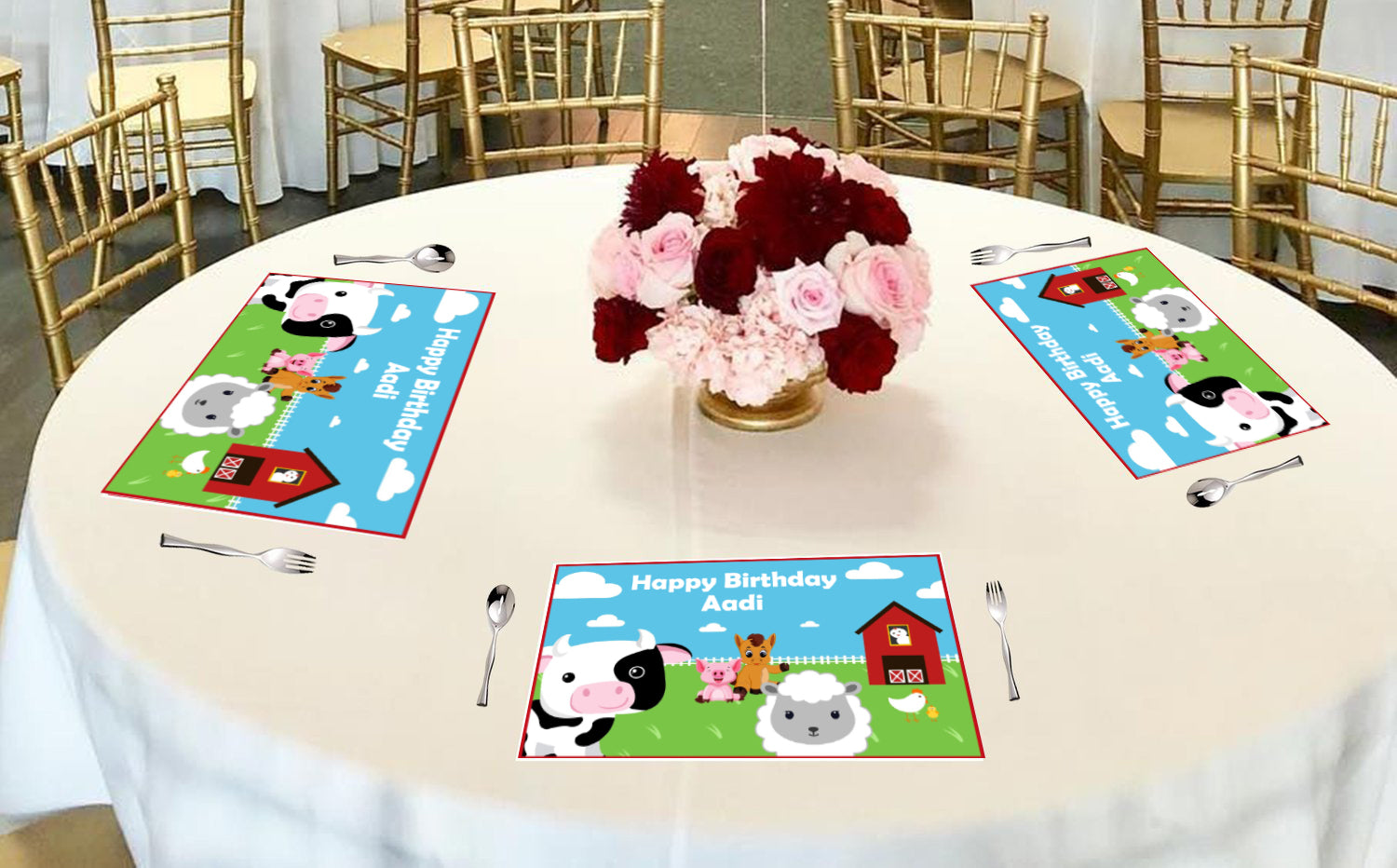 - Farm Animal Birthday theme birthday party table mats will delight all of your guests. Add these themed table mats to make a remarkable table setting.