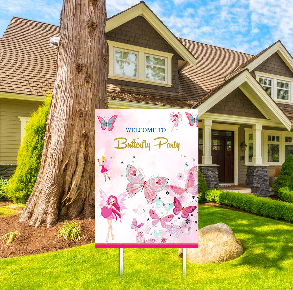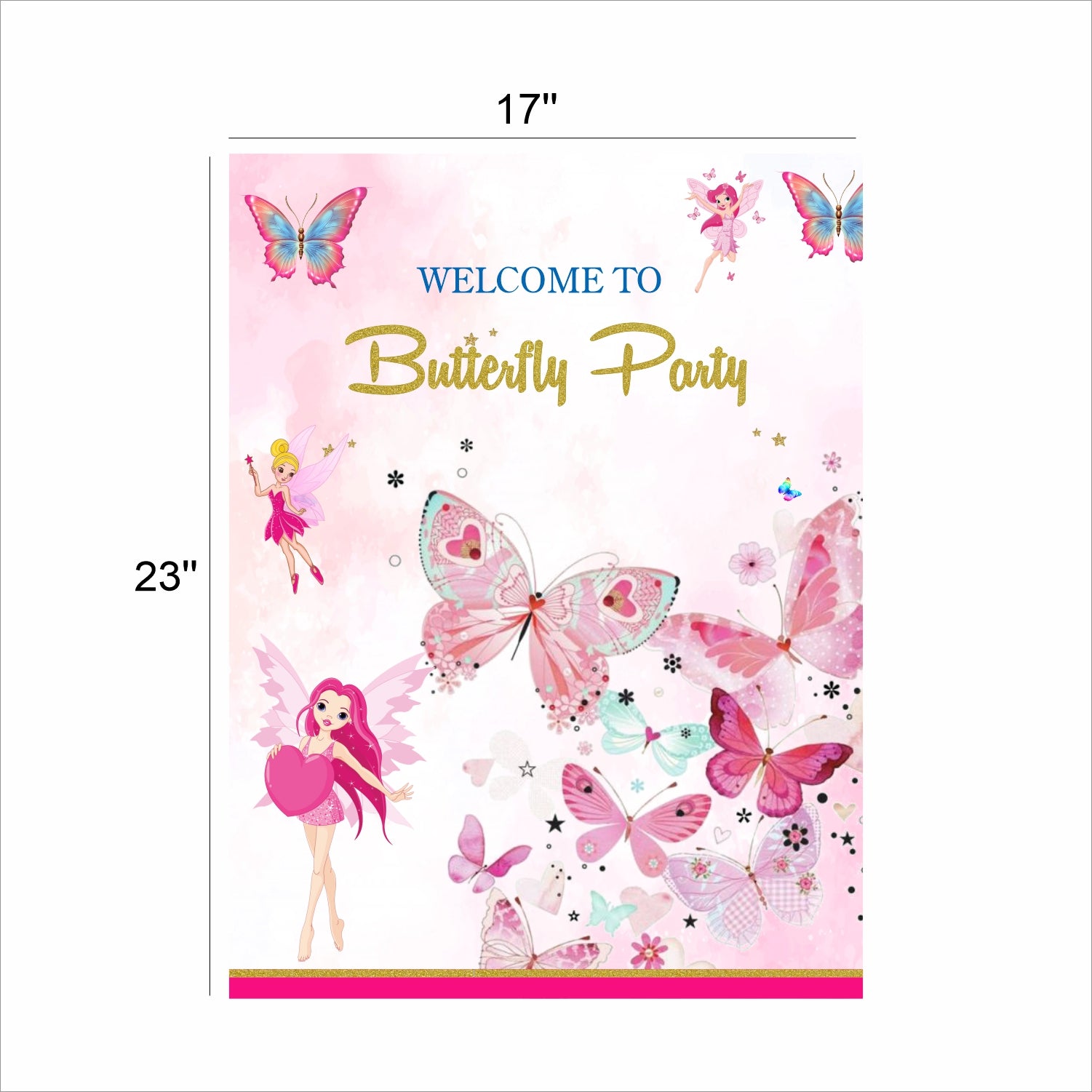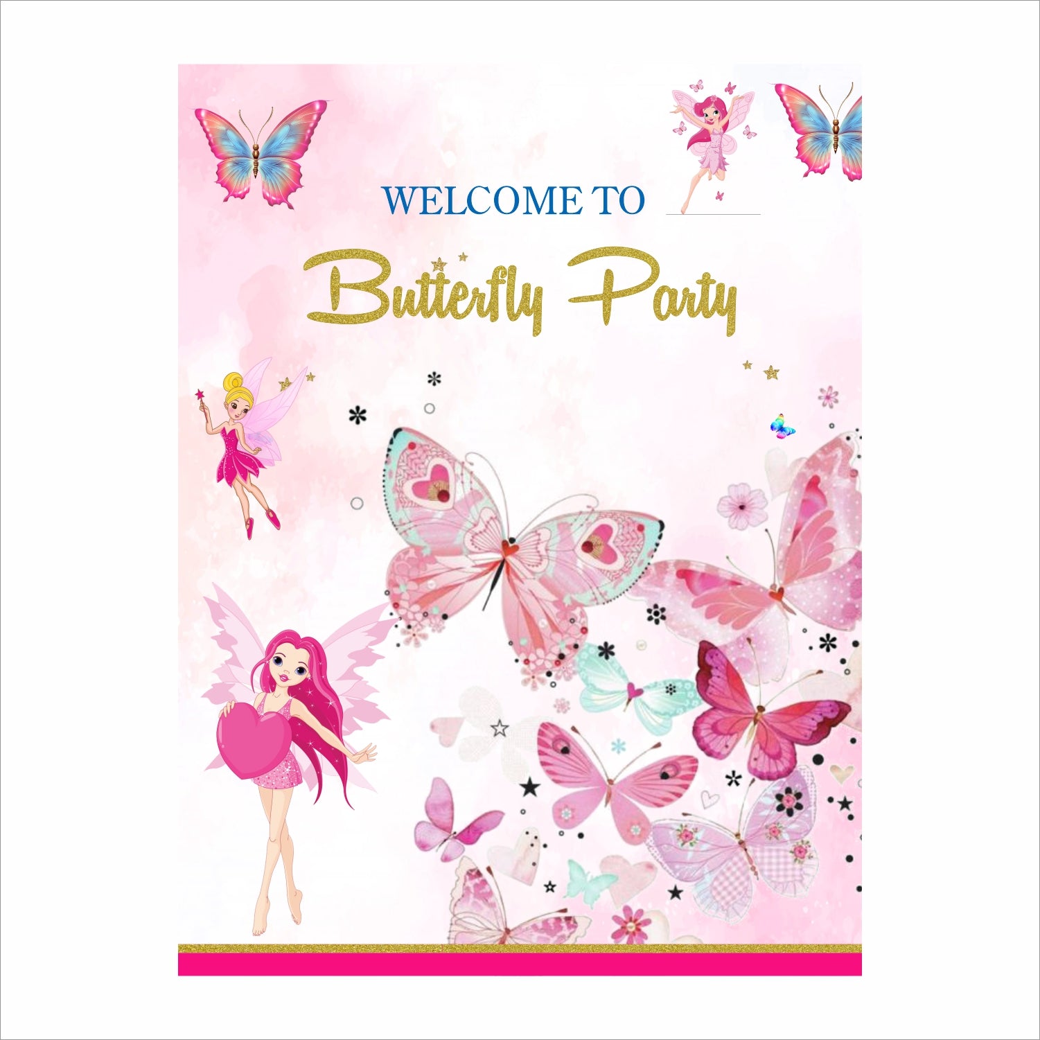 - The Butterflies & Fairies theme Welcome board sign is ideal for any home location or outside space. Welcome your friends and family members with a stunning welcome birthday party board.