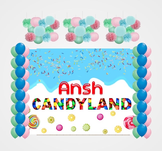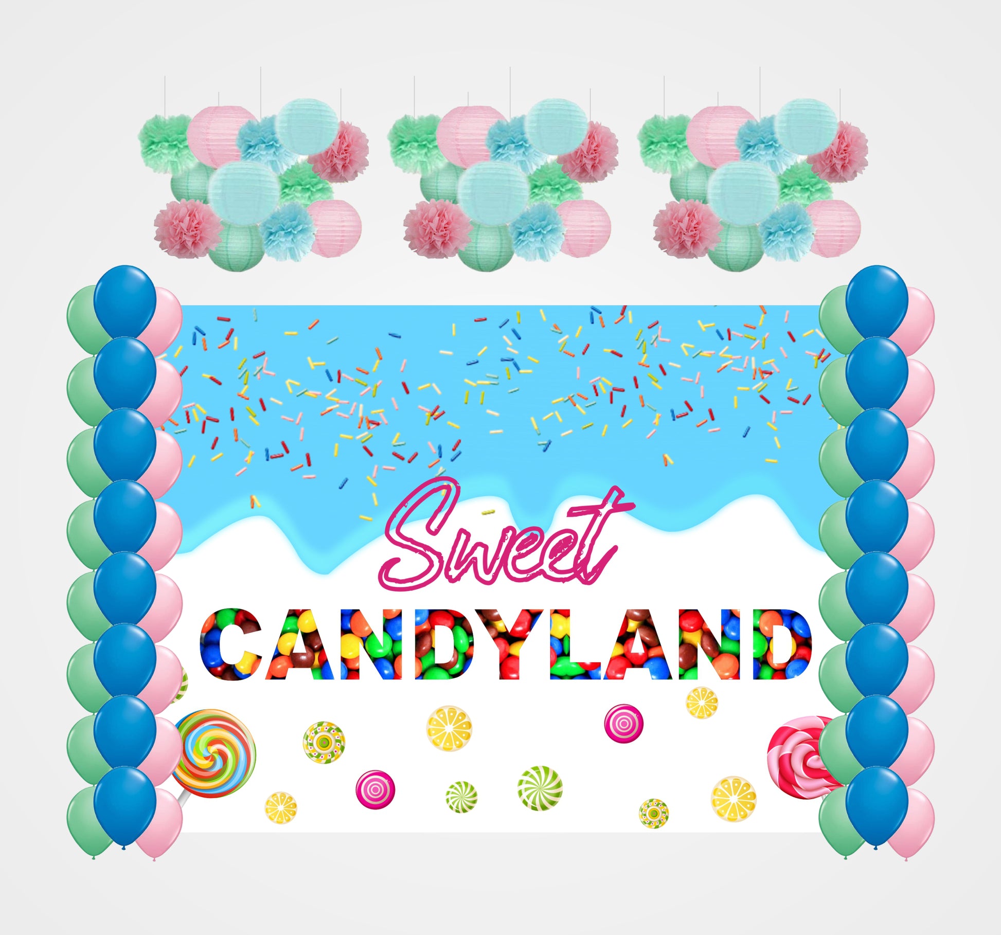- Package includes - Candyland themed birthday party supplies kit included Backdrop-flex material light and thin , Balloons- 60 pcs Latex gold quality 20 pc each pink , blue and green and 6pc Pom Pom and 6 pc paper Lantern (2 pc each Pink green and blue ) .All of the kit is useful for birthday party.