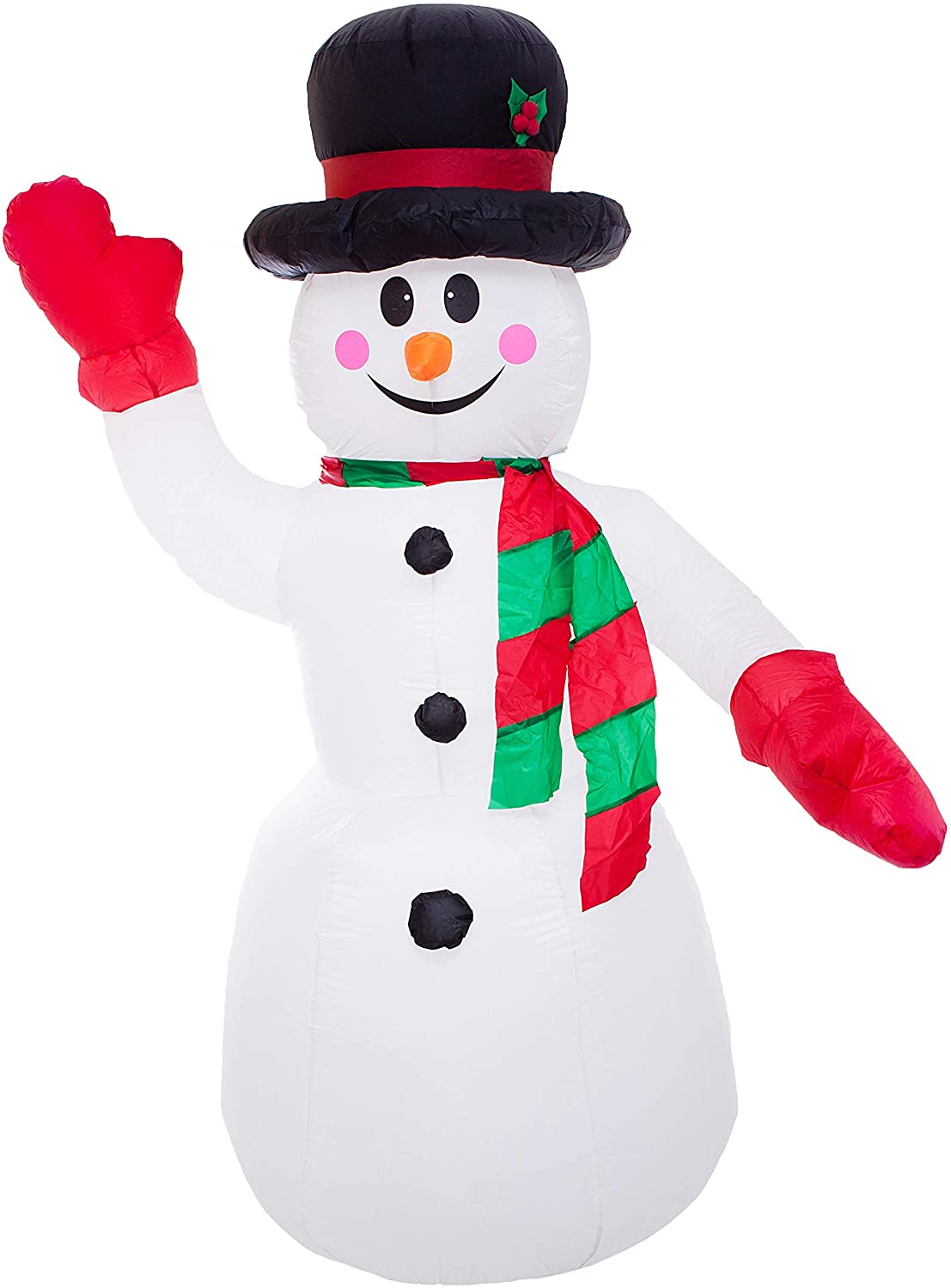 - This giant snowman is very cute. He complete with decorative black hat with plastic holly berries, red & green scarf, all these make the inflatables colorful and provide a strong ambience of holiday. It's an attractive inflatable Christmas decoration, especially when you turn on the light installed, it will make your yard more beautiful at night.