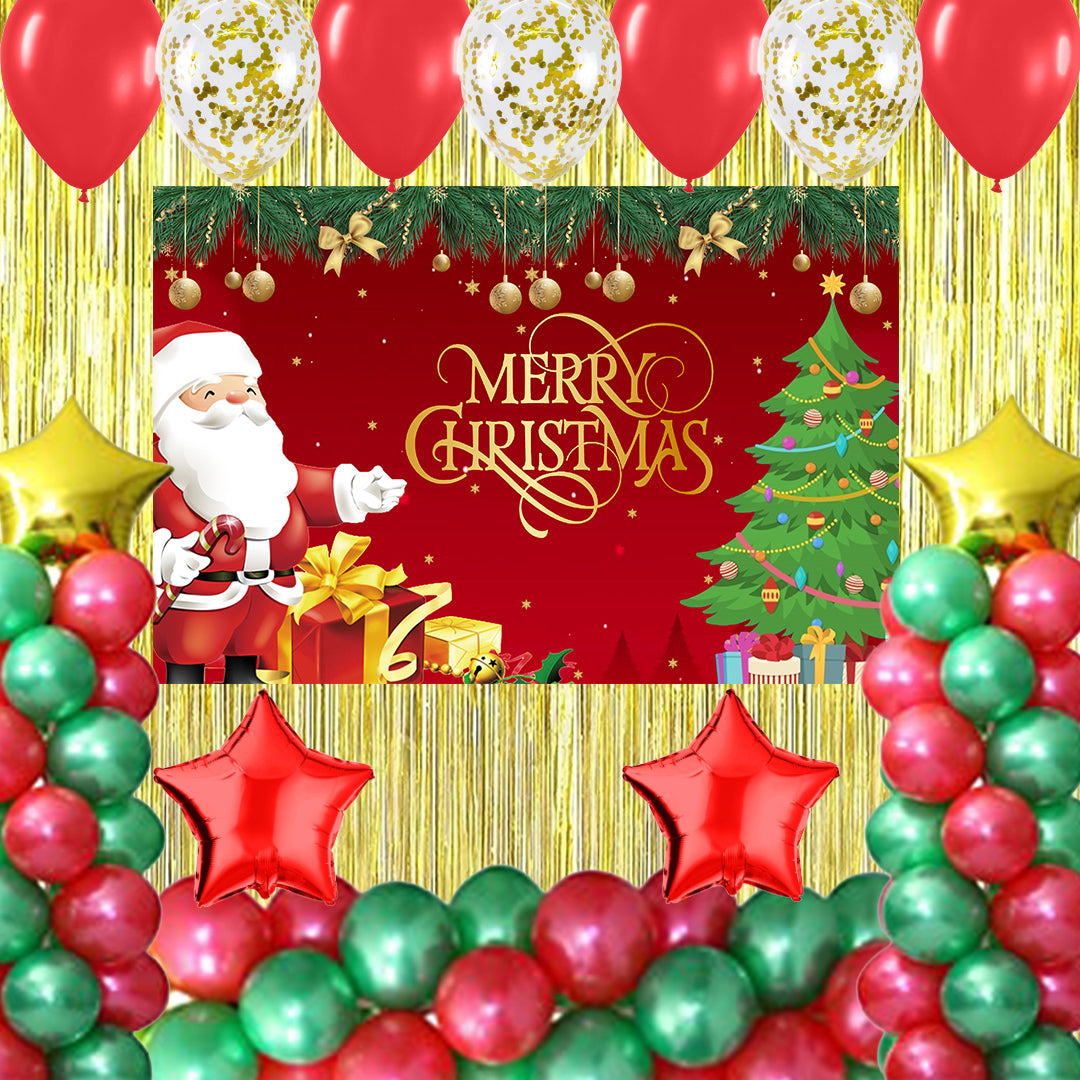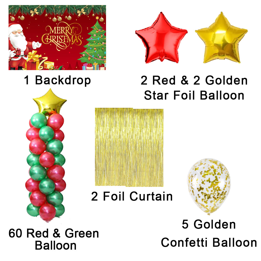 Package Includes -2 Pcs gold Fringe curtains; 1 Christmas backdrop- Size 4 by 4 ft, 60 pc latex balloons Red and green 30 each); 5 pc gold confetti ,2 star Red and 2 Gold star 18"inch.